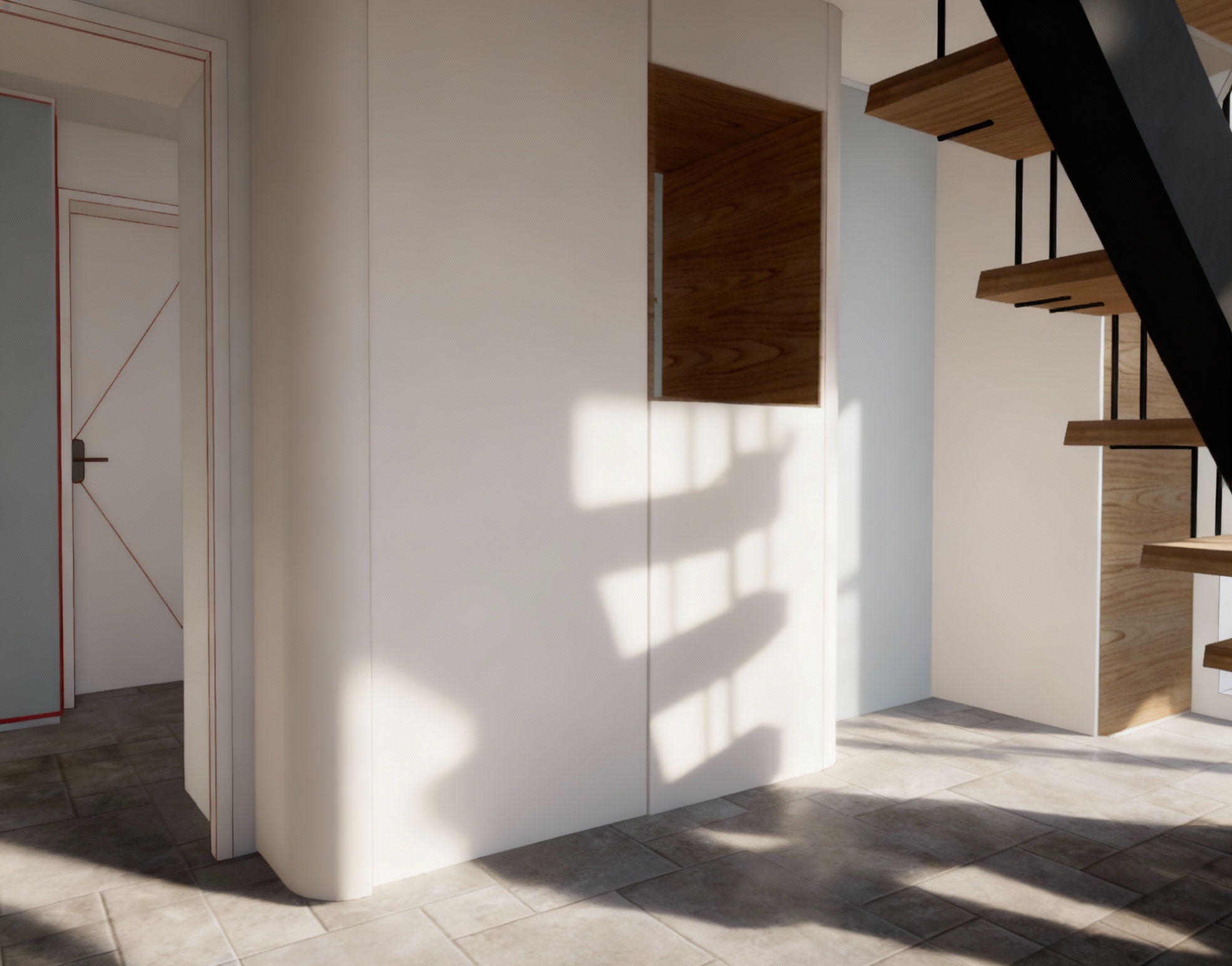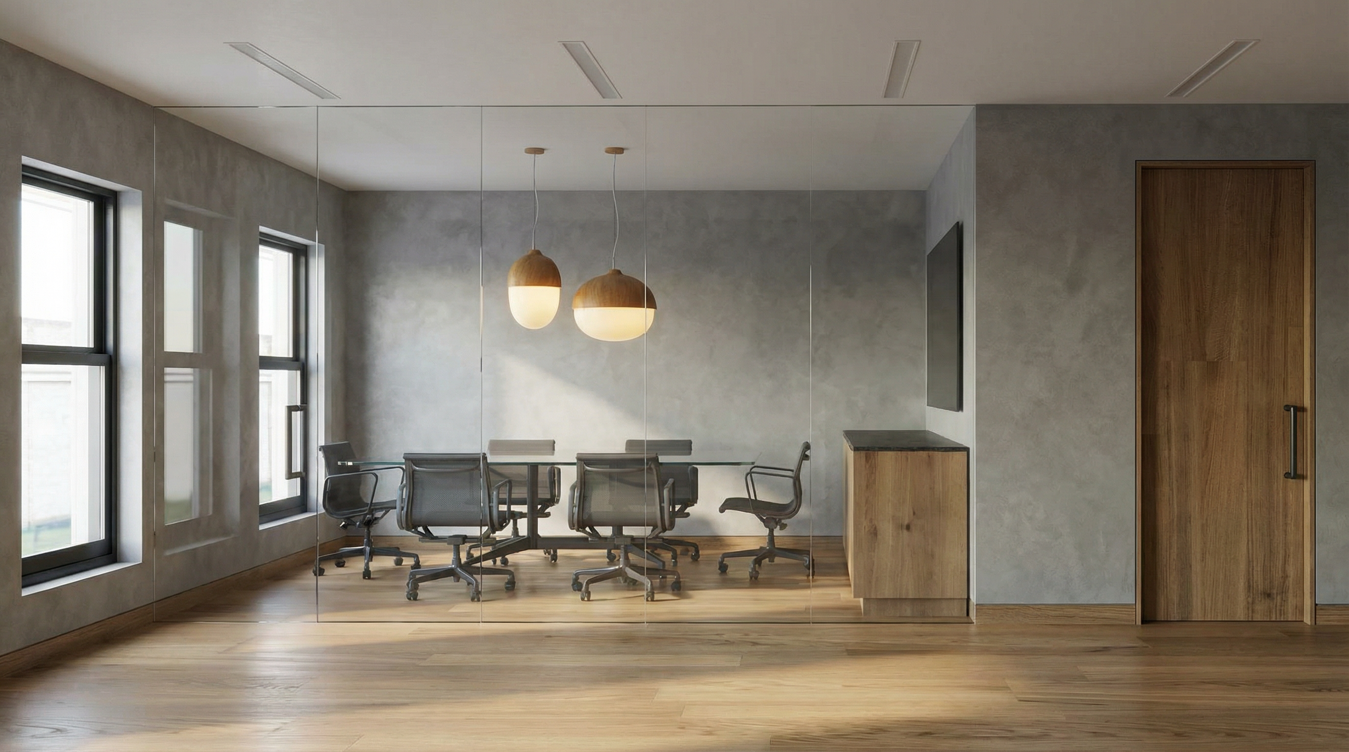 make floors and wood door wide plank select white oak keep chairs the same color as original image make the grey walls a grey lime wash paint