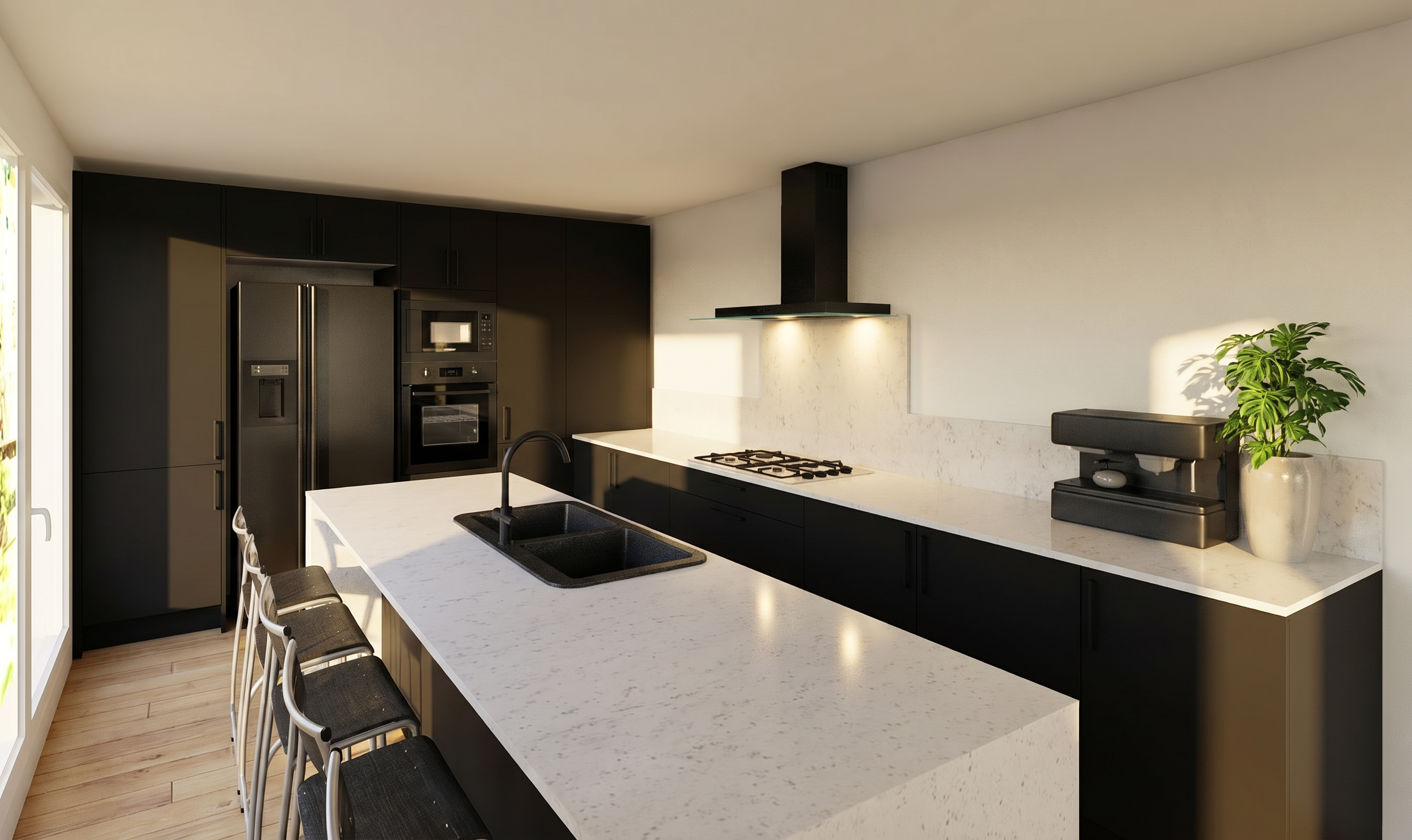 professional architectural interior design photograph living room renovation a focus on a sophisticated and refined aesthetic with floor to ceiling bookmatched calacatta marble slab walls integrated recessed led cove lighting in a new coffered ceiling casting soft warm light new wide plank wire brushed natural white oak hardwood flooring with a subtle matte finish custom designed built in natural white oak cabinetry and shelving units with integrated led linear light strips and minimalist matte black hardware centered is a large low profile modular sofa upholstered in a charcoal performance boucle fabric arranged around a custom milled large natural white oak coffee table with a mitered quartz inlay minimalist matte black architectural track lighting with directional spots clean lines open concept feel bright and airy atmosphere photorealistic 8k resolution sharp focus on new luxurious textures no old wallpaper no carpeting no heavy drapery no outdated ceiling fans