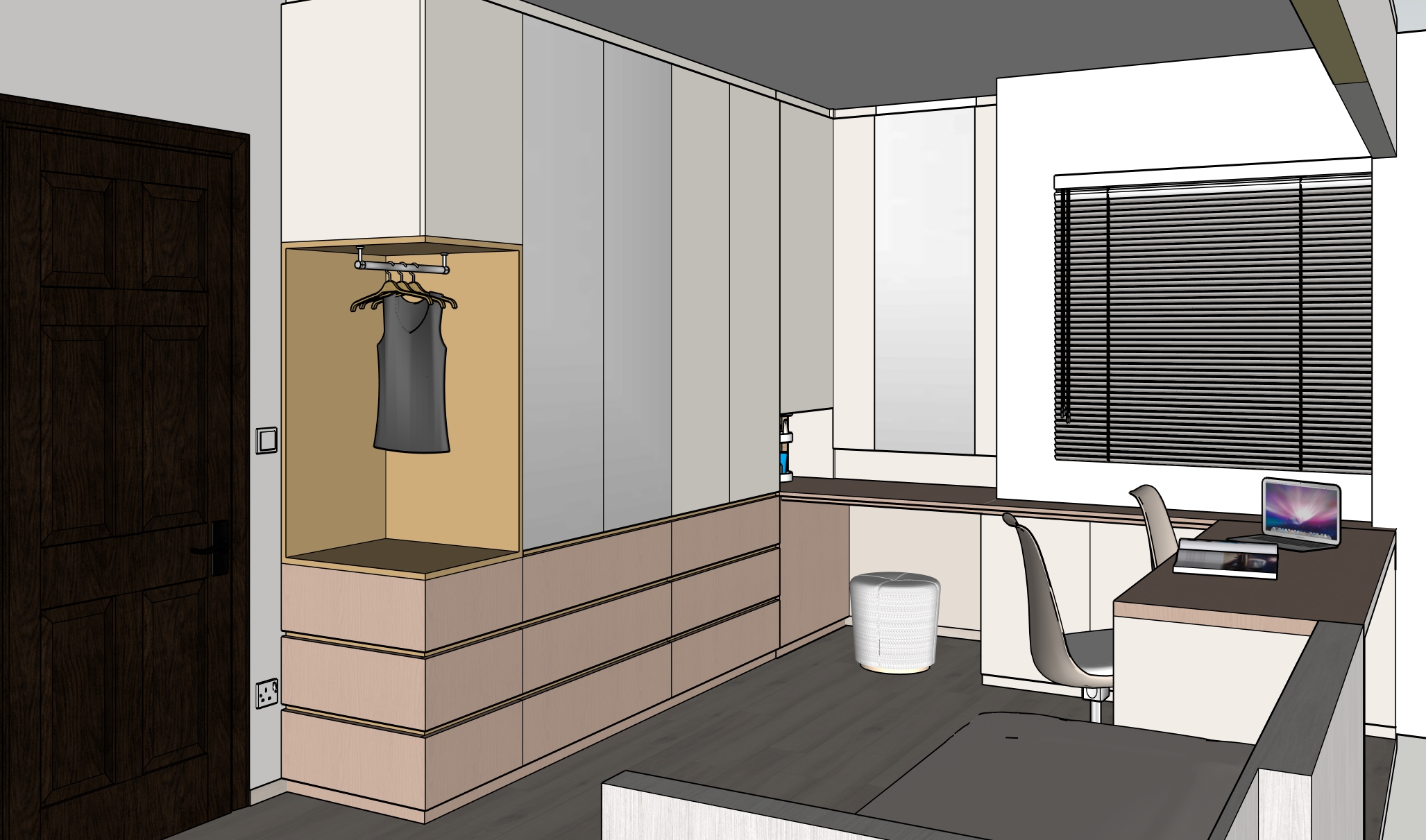 colours to remain accurate as per original given picture wood texture to be subtle 2 doors in the middle of the full height cabinet in mirror dresser top hung middle in mirror drawers and countertop in muted pink subtle wood grains niche and 20mm recessed handle profile on drawers in mustard top half of carpentry in light beige 2 casement door below window in light beige