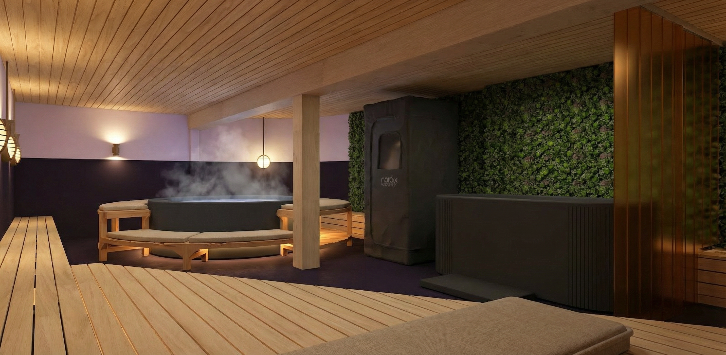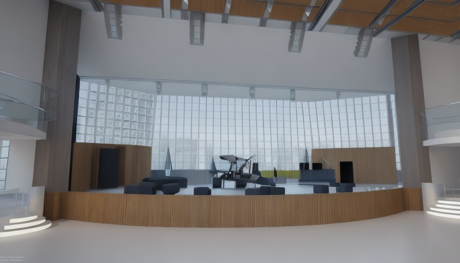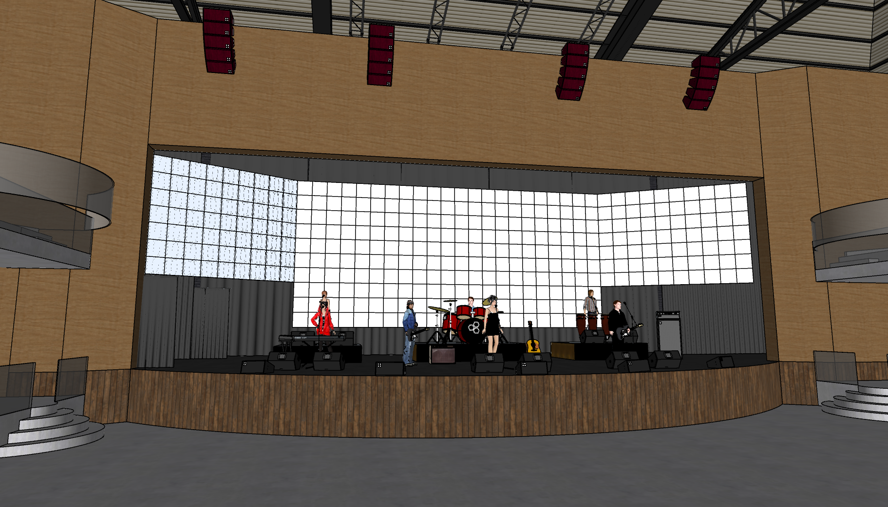 le corbusier interior shot new urbanism perspective shot keep the exact camera angle distance and perspective from the supplied image do not move the camera or change focal length convert this scene into a photoreal upscale nightclub at night preserve the architecture exposed steel trusses balcony railings ceiling height stage shape wood fascia rigging positions and the single led wall do not change the geometry the audience area in front of the stage is a sunken dance floor that sits lower than the surrounding level the perimeter walkways and lounge platforms around it are higher preserve this elevation change do not flatten the floor levels add dramatic stage lighting with visible beams and subtle haze originating from the existing fixtures on the truss the single led wall should be slightly dimmer than the stage lighting display one unified abstract motion background clean and consistent no collage no text no logos no photos add a rectangular picture in picture imag overlay inside the led wall content as if routed through a switcher the led wall is the only screen do not add any other displays add upscale lounge seating with premium materials like leather velvet brushed metal and dark wood around the higher perimeter areas increase patron density patrons should face the stage and pay attention to the performers use polished concrete flooring with soft reflections lighting is warm and architectural mood is modern exclusive energetic concert ready architecture architecture
