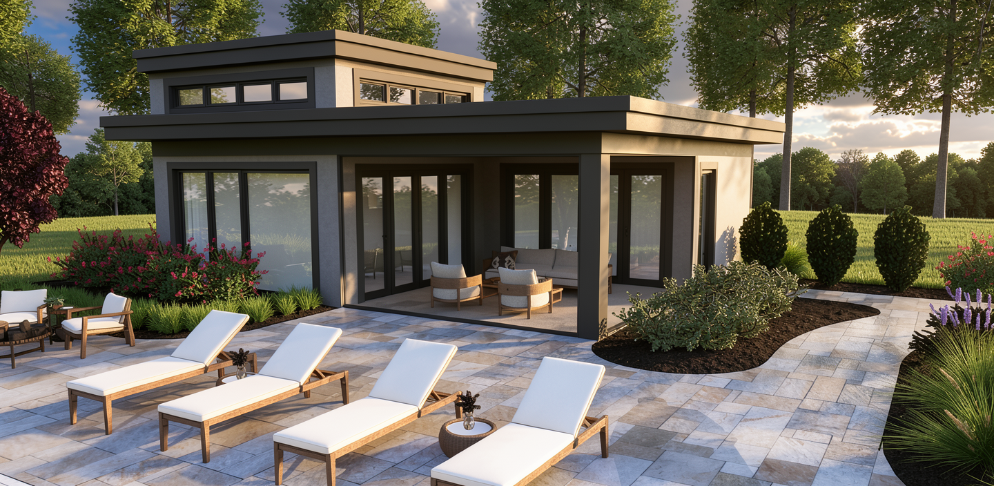 create a realistic rendering of the east elevation of this home the stone is grey white and the siding is painted black the windows are black modern windows there is a 2 5 trim around the windows that is painted black the roof is black this is a wooded area in wisconsin use local shrubs and trees the deck is modern and has black rails there is no siding on the far left window look at the plans and copy them exactly the top part of the house does not have stone that is the roof