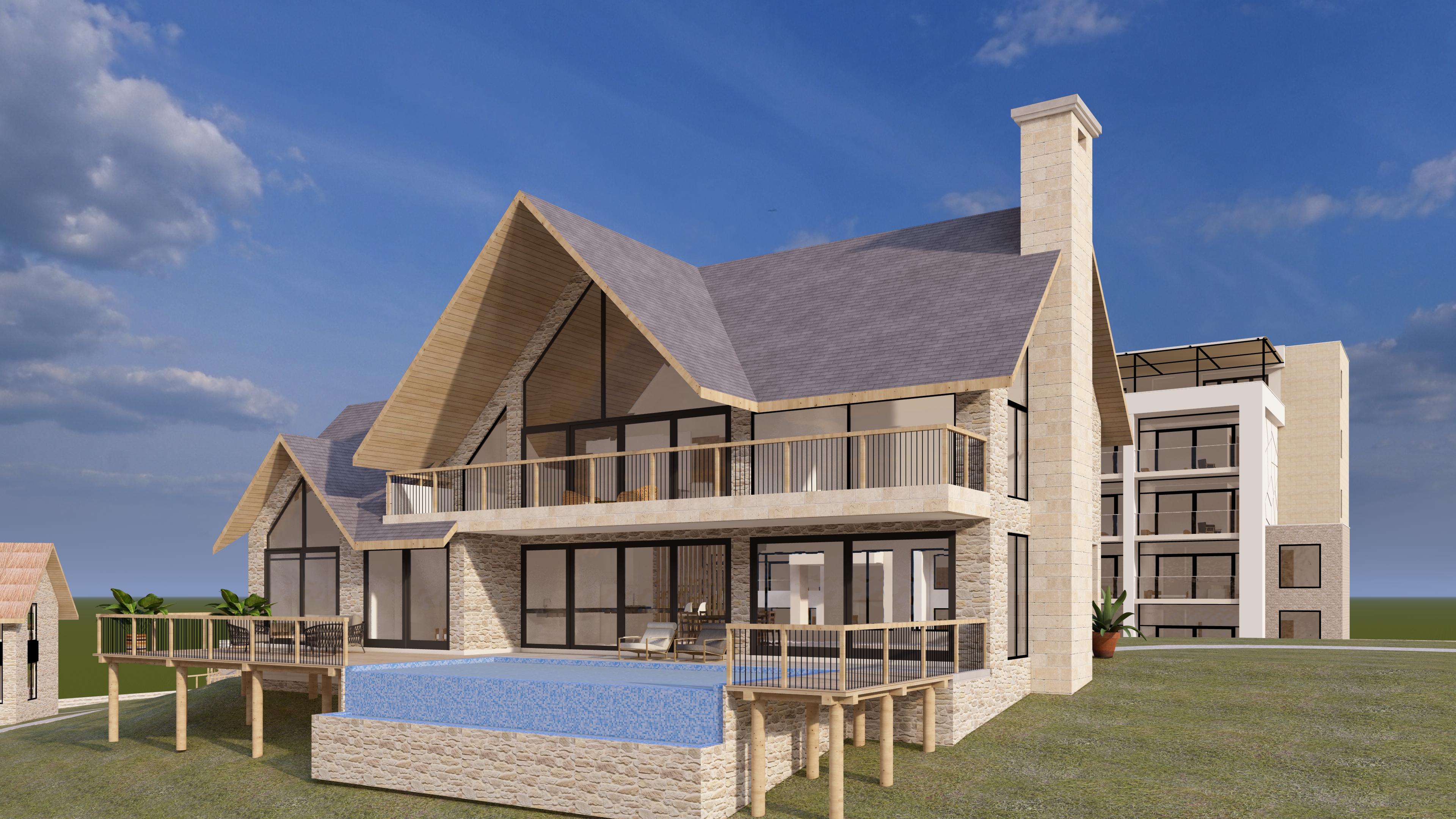 this is a model of a house add few trees in background for context add vegetation with some floral ones