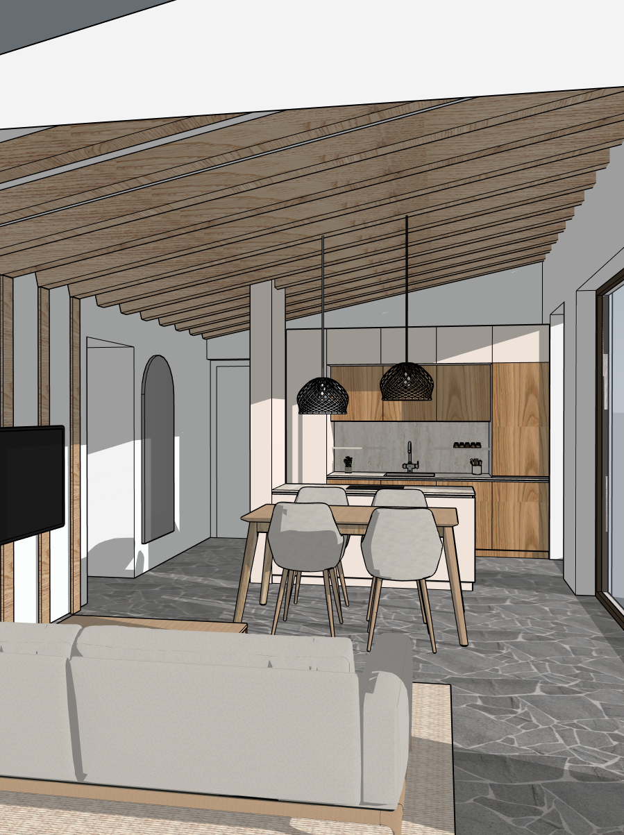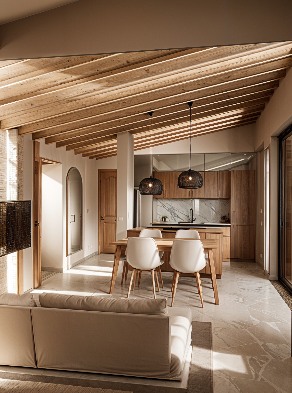 interior shot render a modern mediterranean style interior with a cozy and inviting atmosphere the space features a light gray couch with a natural wood frame the textured gray stone floor contrasts with a light wood ceiling with exposed beams enhancing the warmth the kitchen cabinets are a combination of matte white and natural oak with a white travertine backsplash and countertop include a wooden dining table with light gray upholstered chairs the room is softly lit by two black woven pendant lights creating a calming ambiance large windows on the right side let in natural light emphasizing the neutral and earthy color palette