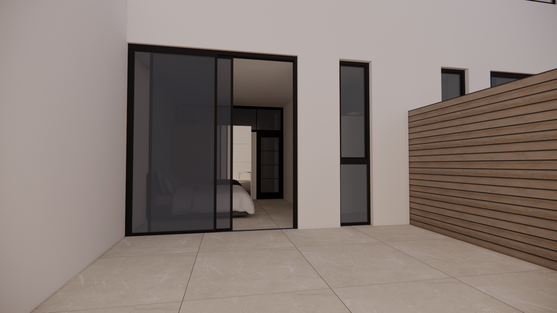 create a hyper realistic rendering with soft morning light through the doors interior shot of modern bedroom with doors opening up to yard with seating area and greenery the flat is in athens greece modern abstract artwork above bed colourful throw on bed modern linear pendants above nightstands hidden led lights on the ceiling all lights off tone should be relaxing and inviting bougainvillea