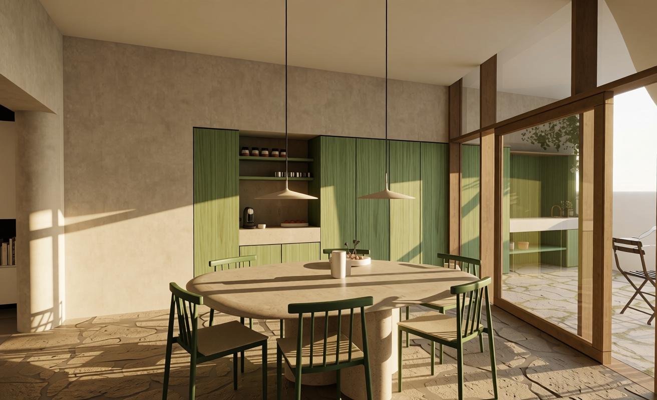 an atmospheric outdoor scene featuring a terrace made of natural stone flagstones with grass growing naturally between the stones a built in cabinet wall made of washed green wood includes an outdoor kitchen with a natural stone countertop a climbing plant grows organically along the cabinets adding a lush natural feel preserve all original materials and the existing composition soft natural daylight warm and inviting atmosphere realistic textures harmonious color palette high end outdoor design calm and timeless mood replace the white volumes in the lower right of the image with natural shrubbery and wild dense greenery