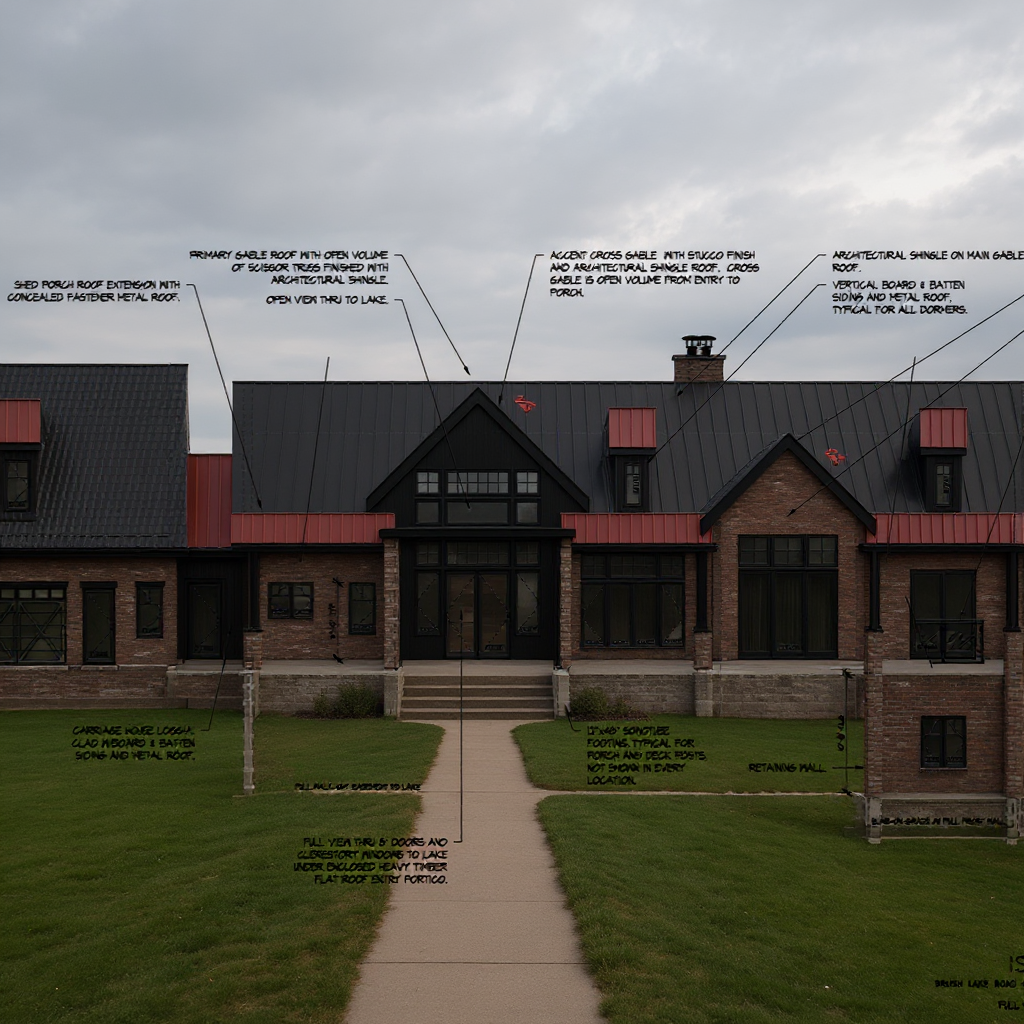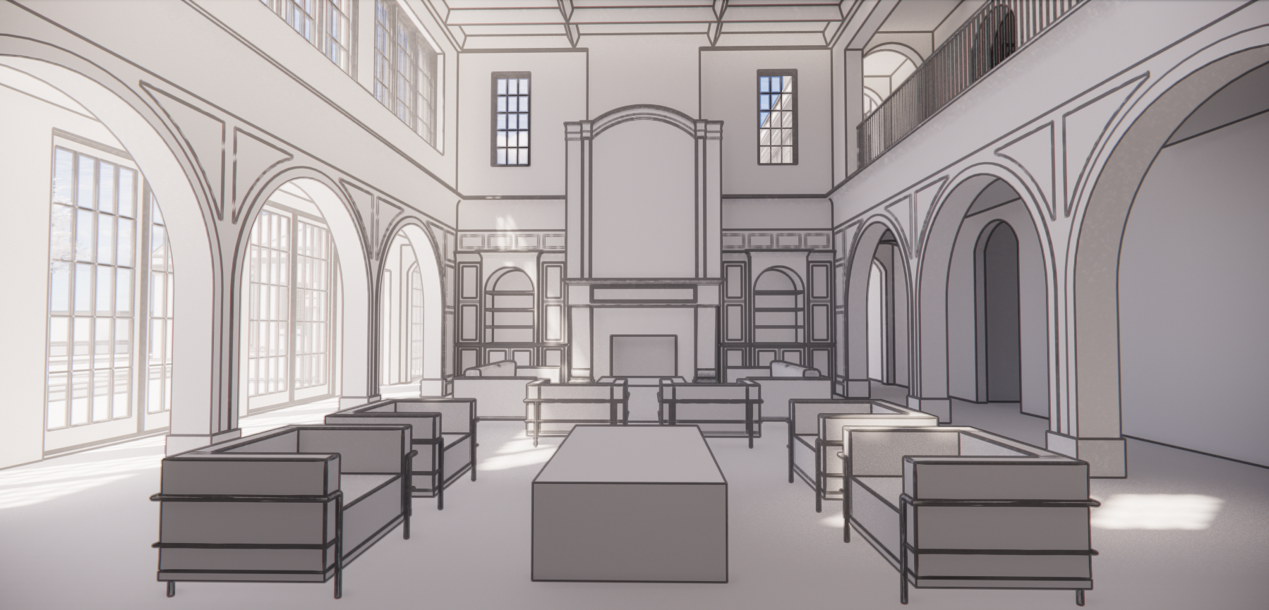 blonde wood floor medium blue gray painted wood trim at arched openings and windows dark charcoal window frames and mullions white limestone at fireplace and chimney dark stained wood at book cases beside fireplace dark stained wood beams at ceiling black handrails at balcony on the upper right add fire in fireplace add tv above mantle change furniture to be more french country style