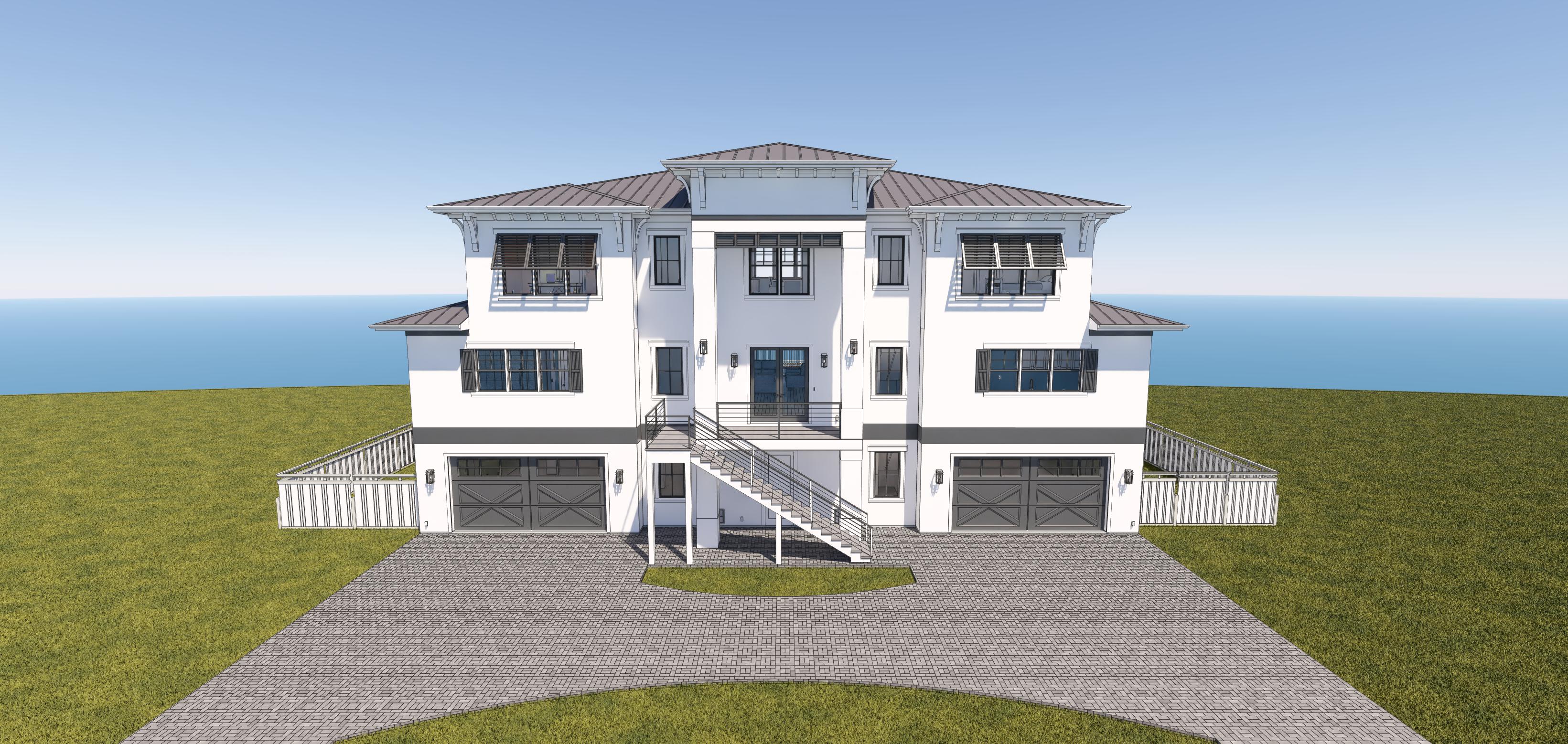 replace background sky with a sunny blue sky with puffy clouds add lawn and landscaping on both sides of the yard change driveway to pavers add grand oaks in the side rear yards add royal palms along fence line water in rear of house driveway is damp from rain add some small flowering plants
