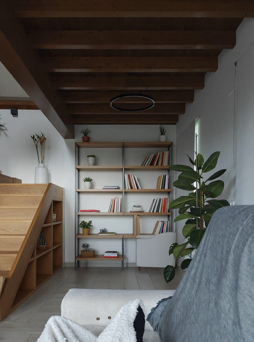 take off hte shelve and table and chair and replace for a nice full wall shelve with plants and books something quite bright not that sofa something escandinavian or modern style close the stair side with a shelve to the beam in wood