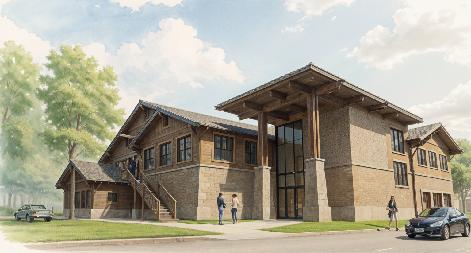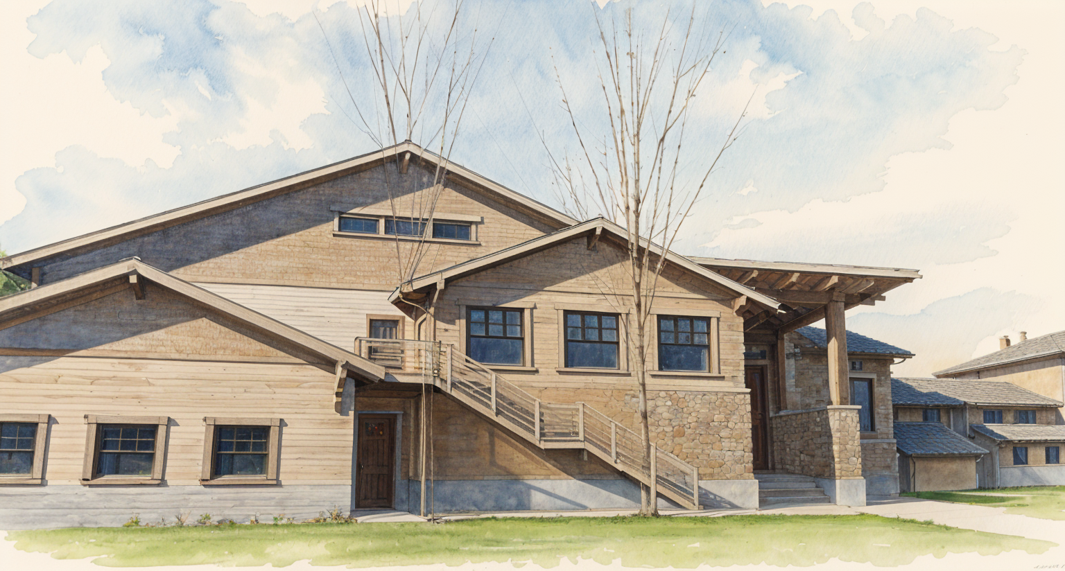 convert this into water color art and add stone finish on the lower half of the building