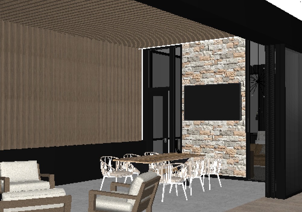 render photorealistic keeping finishes and structure the same ceiling is drywall make windows dark glass image is standing from inside a home looking out to the patio