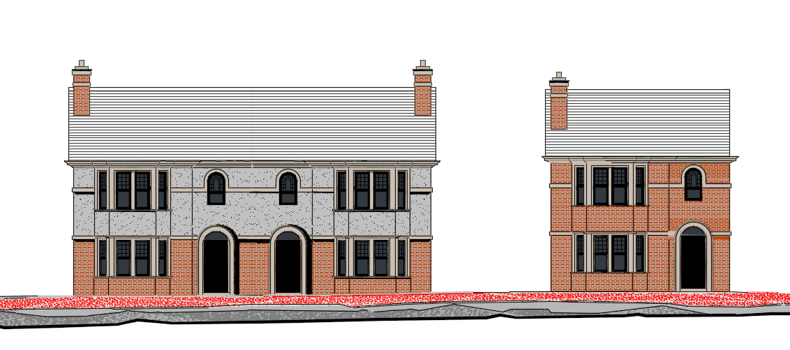create a realistic render showing red brick georgian style houses nestled behind a hedgerow the two buildings in the middle should include a cream render