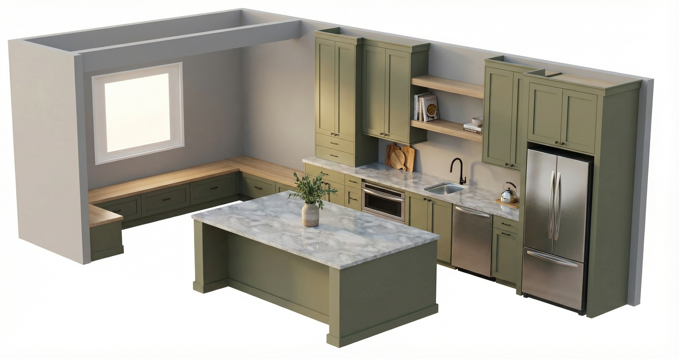 update the bathroom design with the following specifications main floor shower floor install tesoro madras 24x24 tile throughout the entire bathroom floor and continue the exact same tile into the shower floor without any change in size shape or material maintain a continuous uninterrupted surface for a true zero entry curbless transition from bathroom to shower ensure a subtle properly sloped floor toward the drain while keeping a seamless visual flow shower walls tub surround use msi exotica verde as a large format slab like wall surface extend the shower wall tile beyond the shower area and have it drop down and continue around the bathtub as a full surround wainscot feature the tile should wrap the tub walls cleanly and continuously creating a cohesive architectural stone envelope maintain a vertical stacked layout with minimal grout lines and a strong slab appearance vanity cabinets add shaker style cabinetry stained in a sweet tea finish the tone should be a warm medium brown with soft golden undertones keep classic shaker detailing with clean recessed panels and traditional proportions include simple elegant hardware in a warm metal finish such as brushed brass or antique bronze ensure all materials are accurately scaled and all transitions between floor shower tub surround and cabinetry are clean and intentional maintain realistic lighting reflections and texture variation so stone and wood finishes read naturally and cohesively preserve a high end transitional bathroom design with continuous flooring dramatic slab like green stone walls and a fully integrated tub surround for a seamless luxury spa like aesthetic