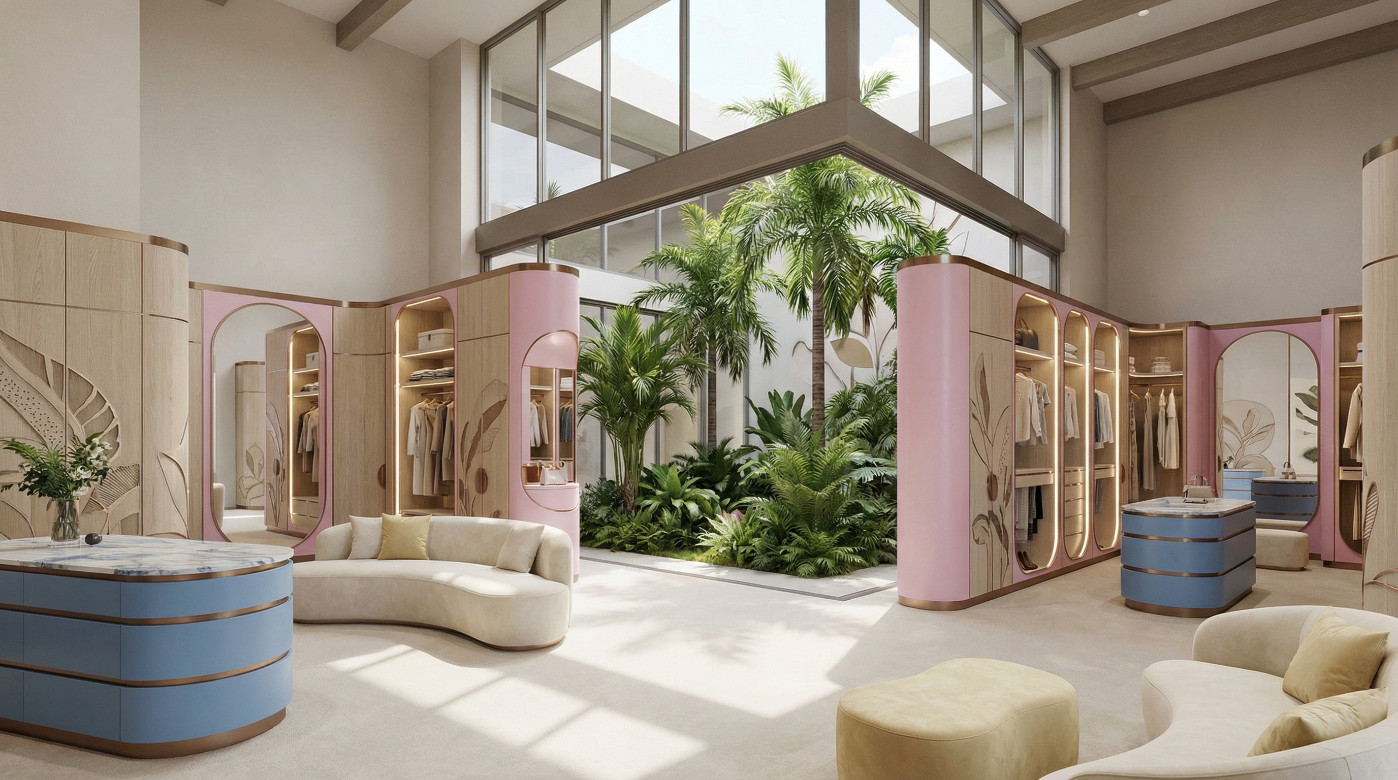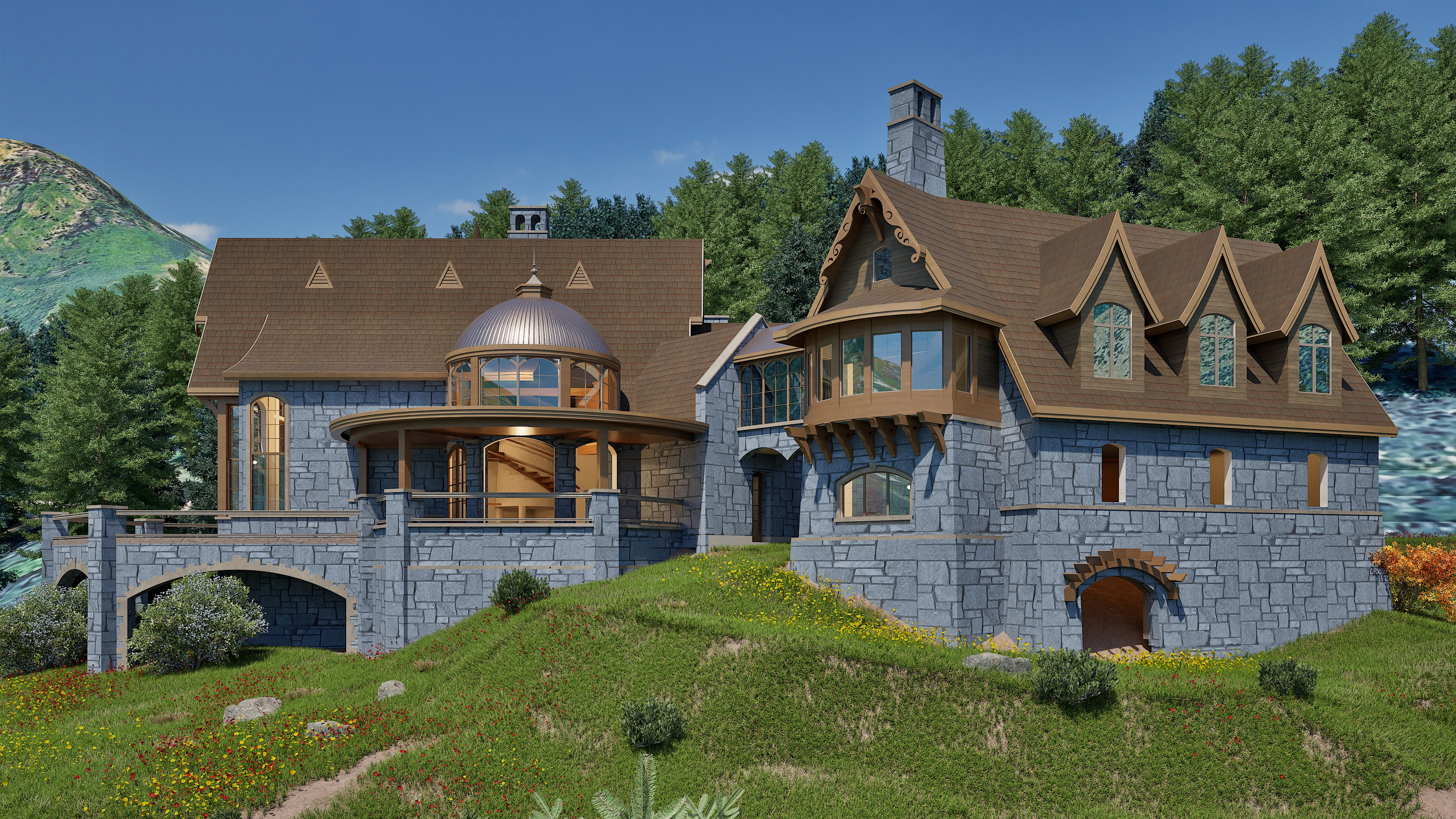 do not change the structure match the colors and materials from the base image stone to be a cool blue and the wood siding to be a smooth plank orange add dense landscaping in the foreground have the background covered in dense trees add lighting illuminating from the windows