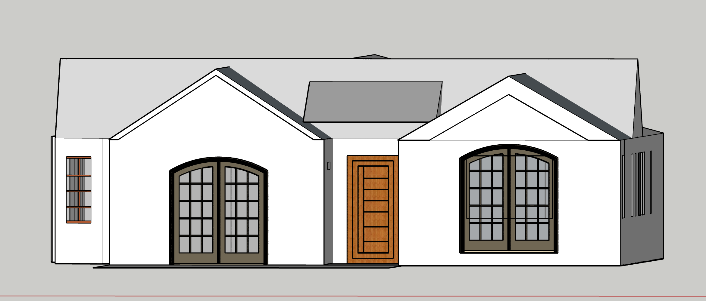 mediterranean revival exterior shot a charming suburban house with a gabled roof in soft gray white stucco walls and classic wood accents the central wooden door in warm oak features prominent panels large arched windows with dark brown frames adorn each side contrasting beautifully with the pristine white walls a minimalist contemporary design set against a serene overcast sky creating a calm and inviting atmosphere architecture