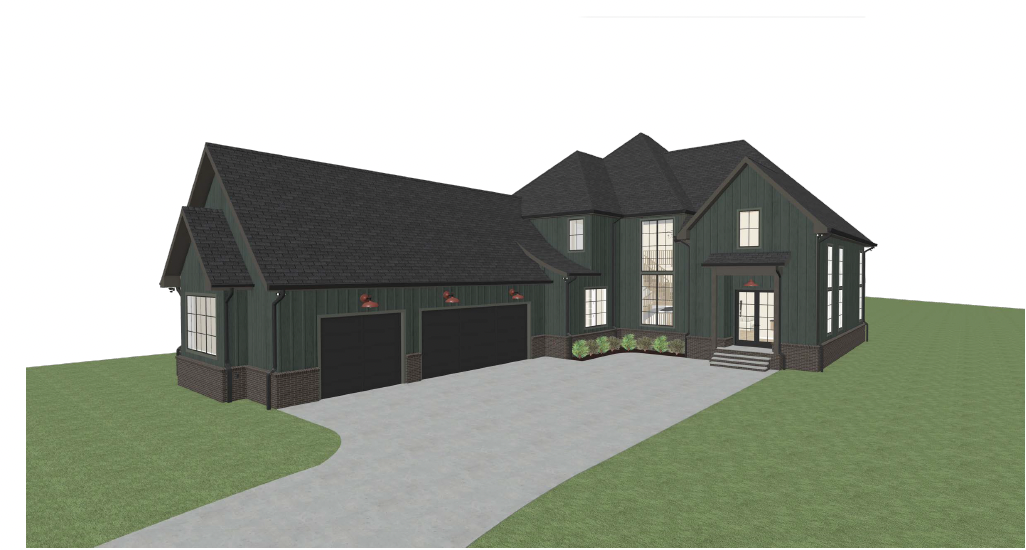 a modern country house with dark green wooden siding and black shingle roofing set against a clear blue sky and tree line off the rear of the home the trim around the windows and the garage doors are a matte black adding a sophisticated touch the front garden features lush greenery with manicured bushes along the base of the house a smooth gray driveway leads up to the house bordered by vibrant green grass the atmosphere is serene and inviting with soft sunlight casting gentle shadows enhancing the texture and depth of the scene it epitomizes luxury