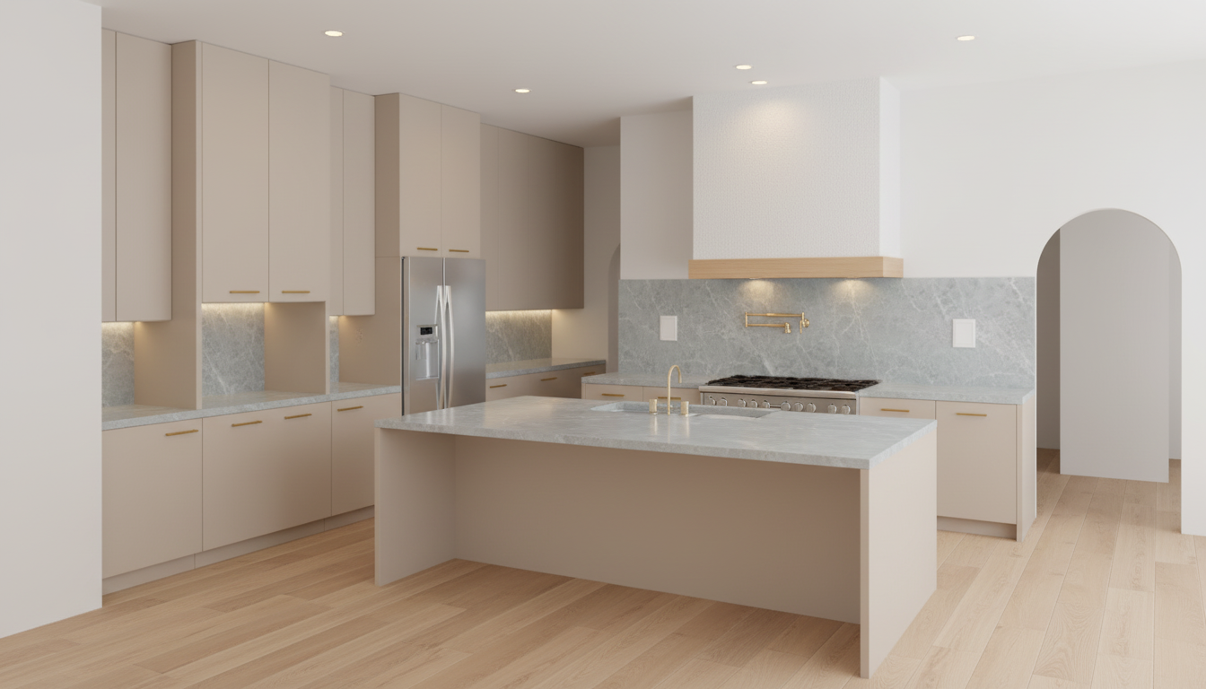 render the island countertop material going down both sides and replace the blue backsplash material on the left side of the image with a white painted wall