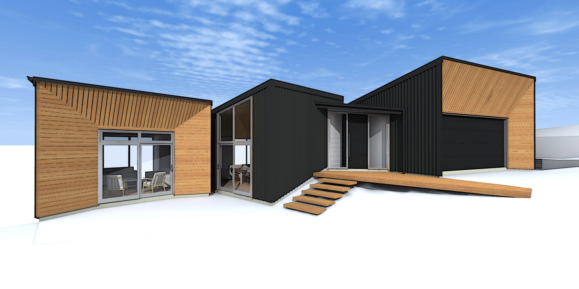 black cladding to house with cedar features black window joinery lawns timber deck extensive native planting background trees sunset