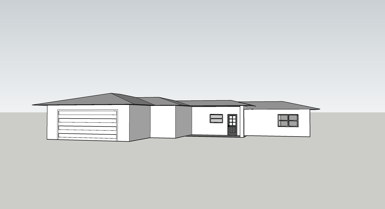 render a modern single story house with a combination of a flat roof and a hip roof as shown in the base model maintain crisp white stucco walls with a clean minimalist aesthetic incorporate a lush florida landscape tall palm trees tropical plants manicured grass and a bright clear sky with soft clouds the setting should reflect a sunny coastal florida vibe with rich greenery surrounding the house preserve the structure and proportions of the original architecture with garage door windows columns and overhangs with realistic lighting and shadows cast on the fa ade right next to the garage is lundry roo walls then the porch