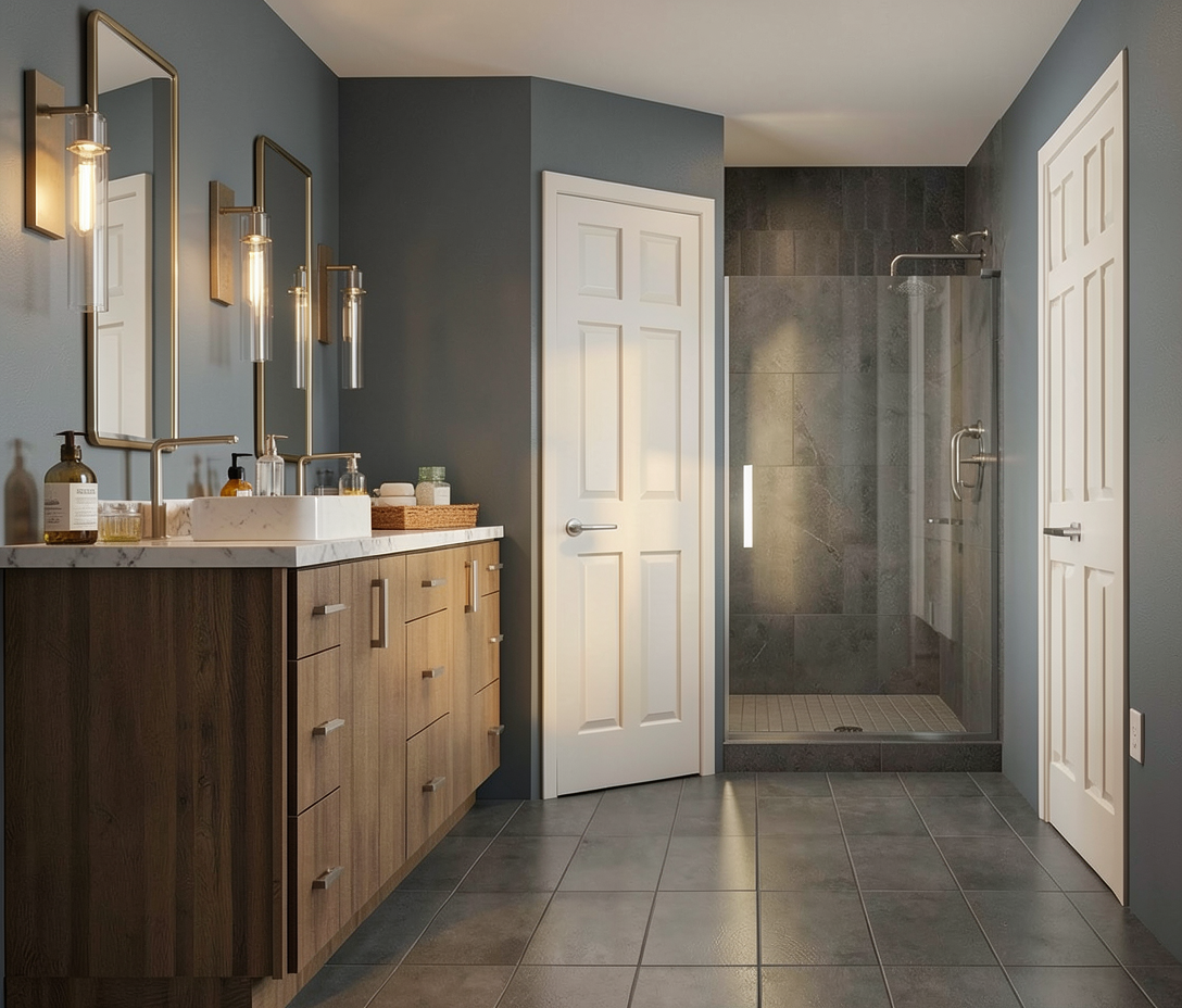 do not change layout rectangle sinks and colors add bathroom accessories on the countertop