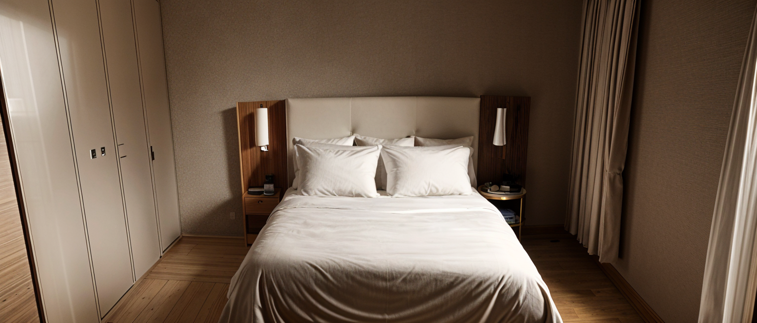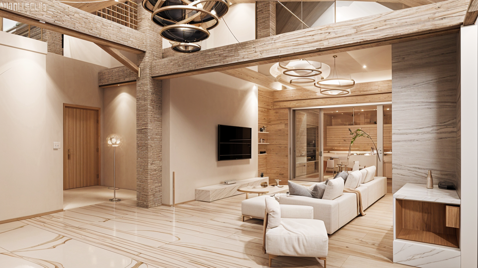 render a cozy modern living room with a rich royal blue accent wall include a sleek black piano against this wall as a focal point add a graceful painting above the piano with soft abstract shapes in white beige and light brown tones arrange four comfortable mustard yellow armchairs around two small round wooden coffee tables with light wood textures include a stylish wooden bookshelf with books and decor on the left side and a soft warm light illuminating the ceiling use a smooth wooden floor and a wooden cabinet with a blue coffee machine on the left let natural light stream through the tall windows creating a serene and inviting atmosphere architecture