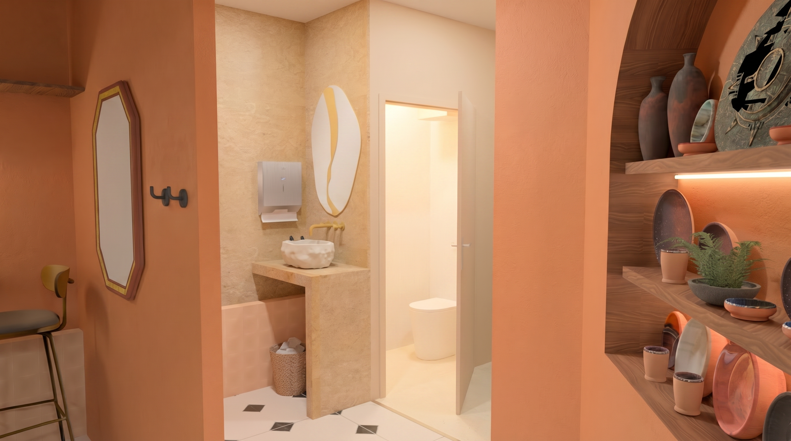 keep the stools but change the color and make it beige velvet add a balcony and a city outside the windows the kitchen counter top is also brown marble