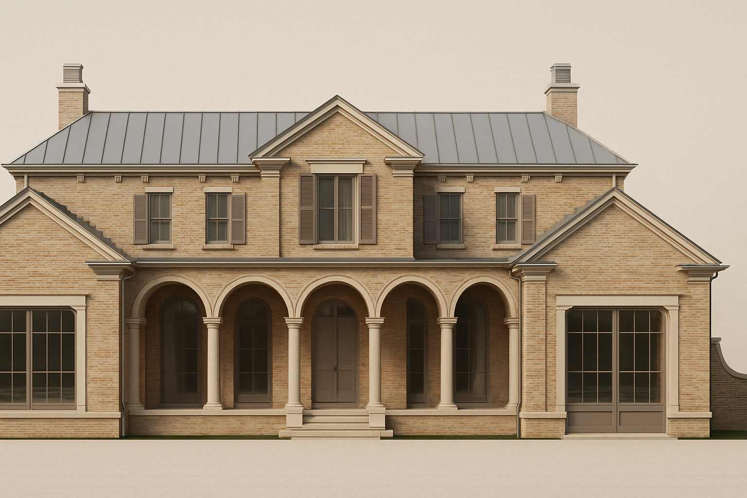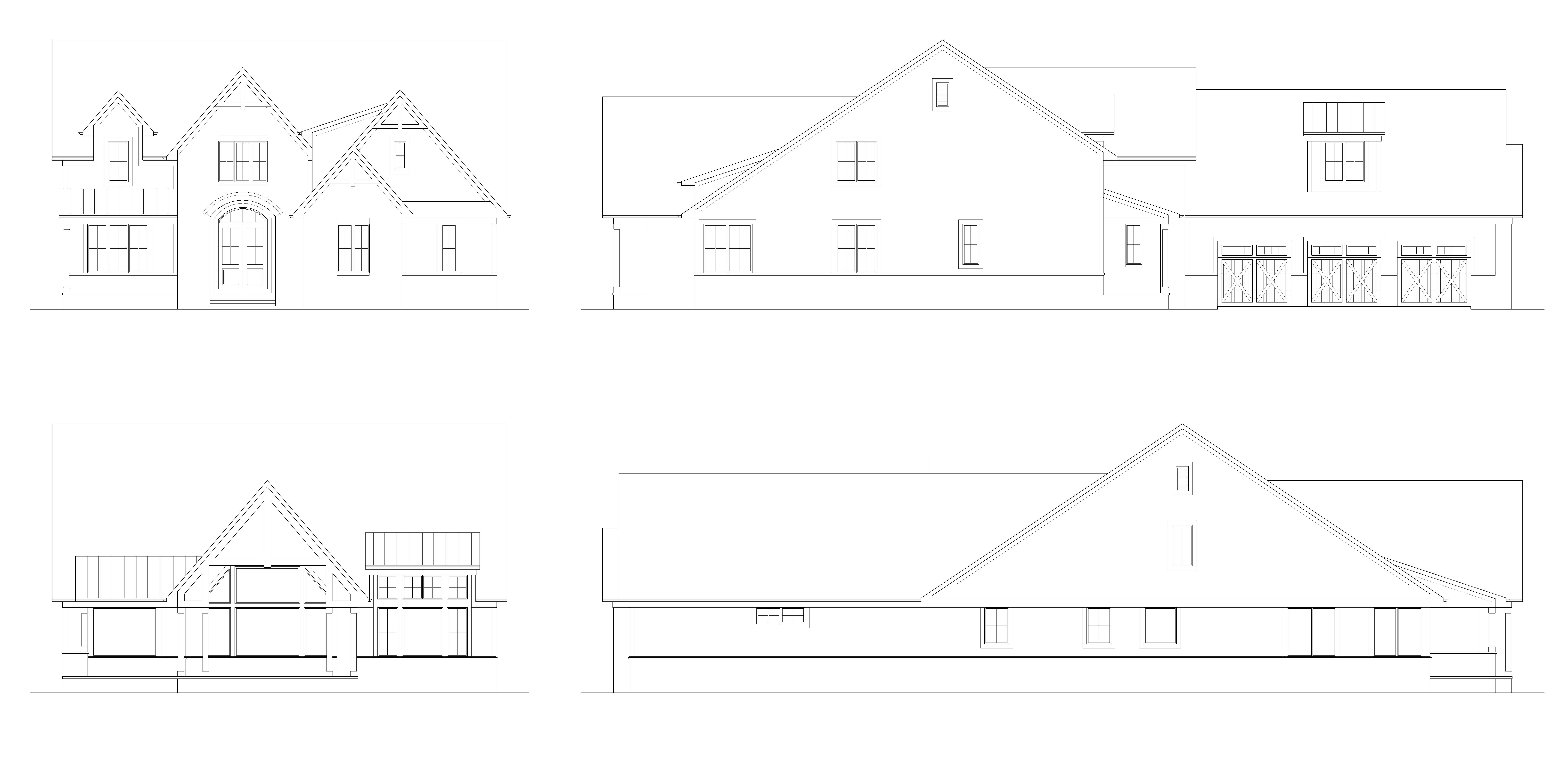 use these 2d elevations to create a rendered 3d exterior model partly cloudy day with deciduous forest behind the home charcoal vertical siding fond du lac stone black roof and black windows concrete driveway