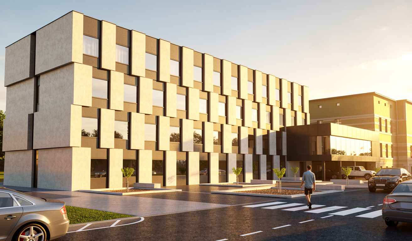 this is a photoshopped render can you make this look stylised and more realistic the walls are a green paint the rooms have fluted glass windows and stucco walls the void railing is fluted glass with a dark wooden railing