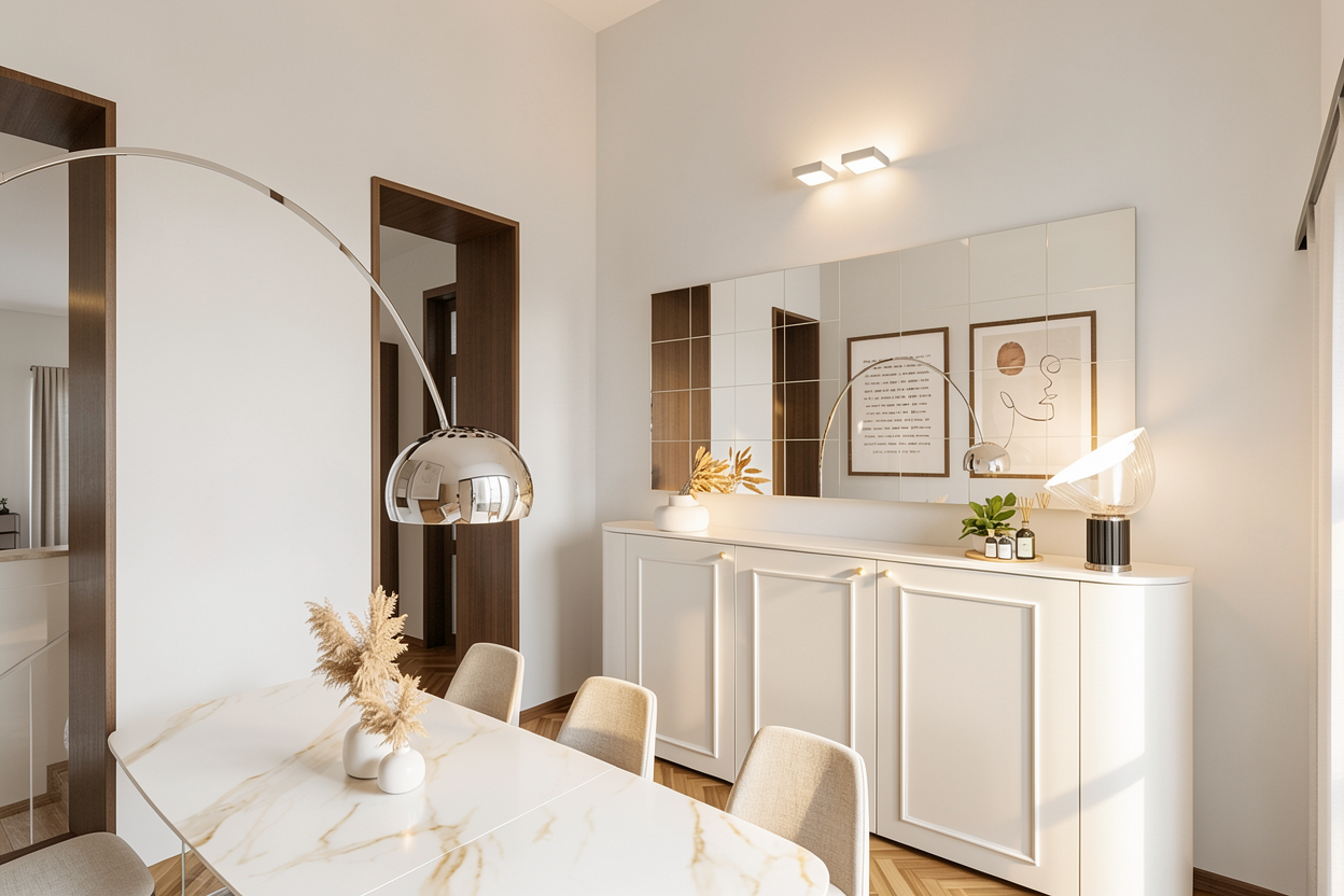the white wall should be white greysih brick the windows should be an outdoor view add cafe supplys and bakery items and add a staff member behind the white counter there should be a space with bar stools between the farther white counter and the brown counter at the back