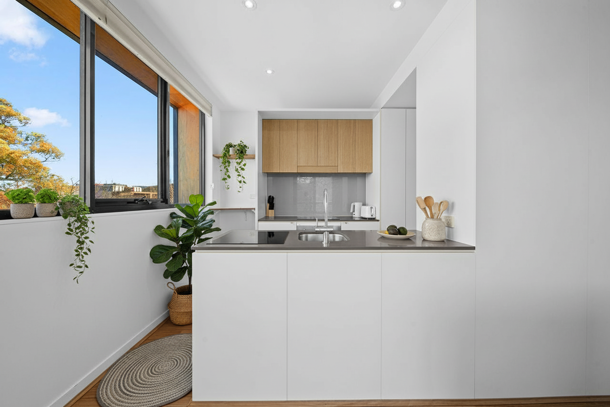 do not add new ceiling lights or shelving in walls add kitchen accessories and plants no table or rug armchair only in the foreground