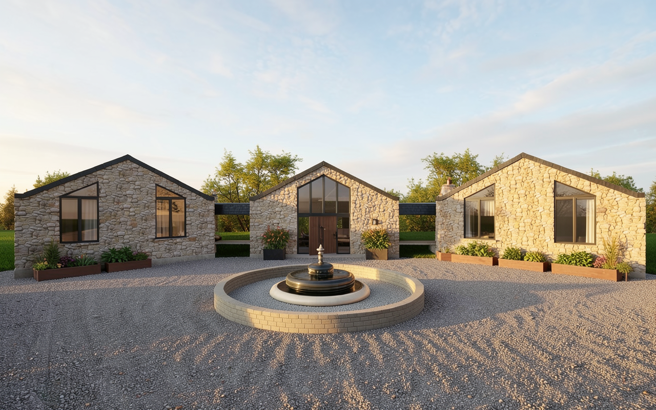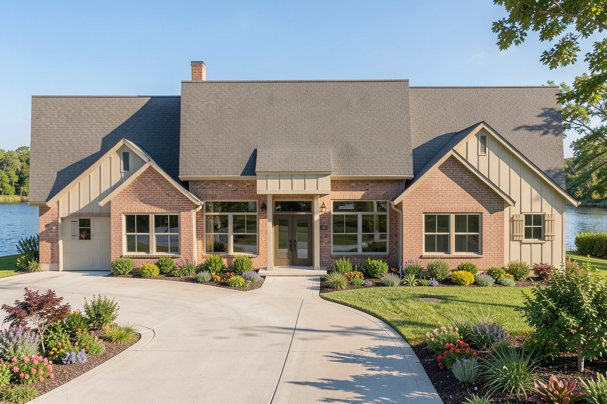 you are a professional image renderer you create the highest grade renderings around and specialize in architectural renderings this is the front elevation of a house create a high resolution photorealistic image of this structure keep the windows as they are where they are keep the doors as they are where they are keep the main structure as it is where it is feel free to change the perspective keep the roofline as it is where is it do not add anything to the structure that i have not asked for the driveway enters in the center of the front elevation and turns to the right garage wing of the house the background will be a property that backs up to a texas lake it should be early afternoon with a bright sunny day clear skies the landscaping should be late summer with color and should be that of a luxury estate
