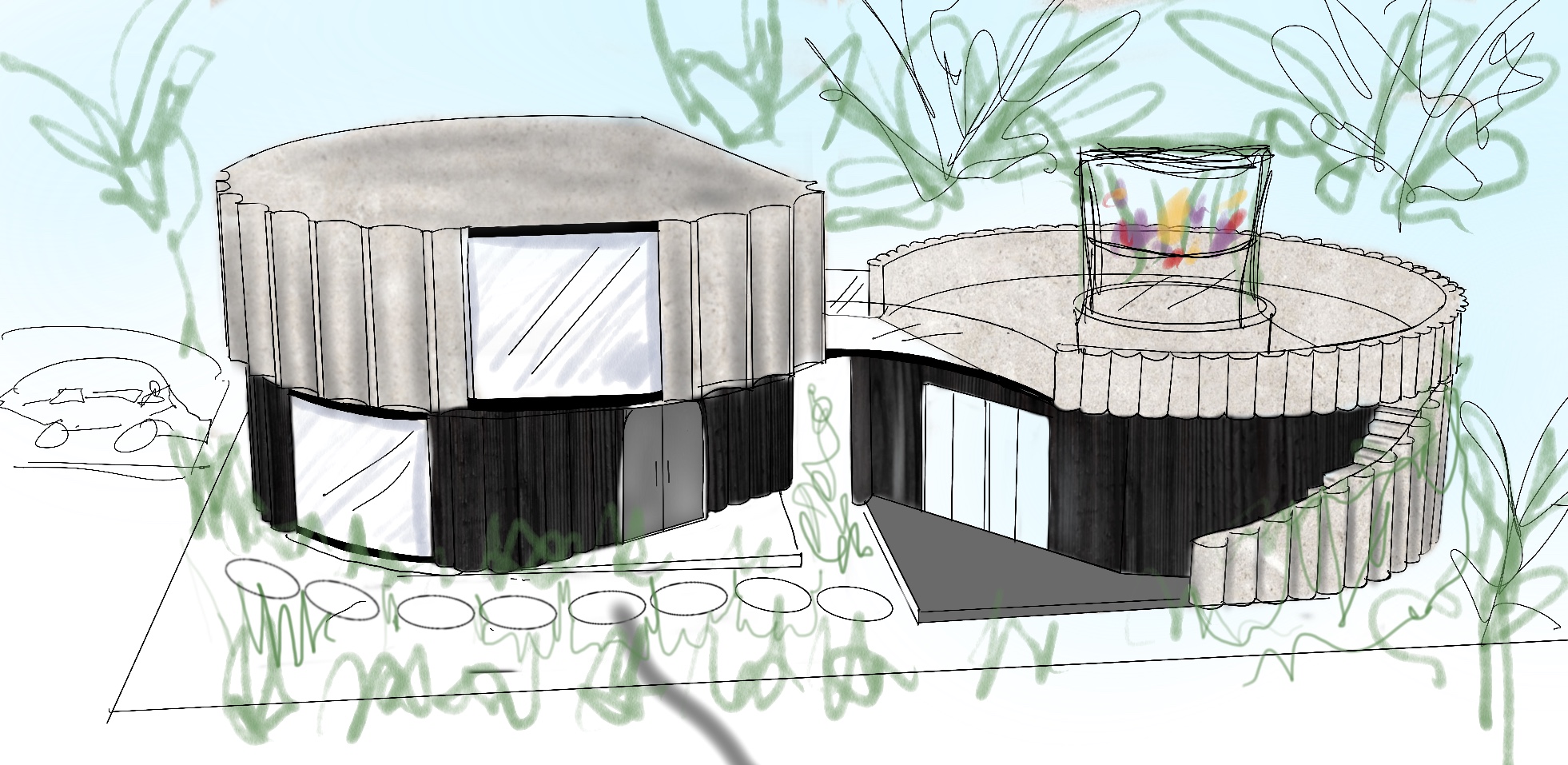 using the first image as the exact geometric and camera reference render it into a fully realistic residential home that matches the material language lighting and realism of the second image maintain the same camera angle perspective proportions and massing as the first image do not rotate reframe or change viewpoint apply the same materials and finishes seen in the realistic reference ribbed concrete or stone cladding dark metal vertical fins at the lower level smooth curved upper volume realistic glass with reflections and subtle weathering set the project in los angeles with sunny clear skies warm afternoon light soft shadows and birds flying overhead add landscaping consistent with southern california low shrubs grasses palms include a modern car parked in the left parking lot only aligned with the site plan the building should read as a high end contemporary home photorealistic architectural visualization quality ultra detailed textures realistic scale natural lighting depth and atmosphere no abstraction no sketch lines no diagram colors photorealistic render only