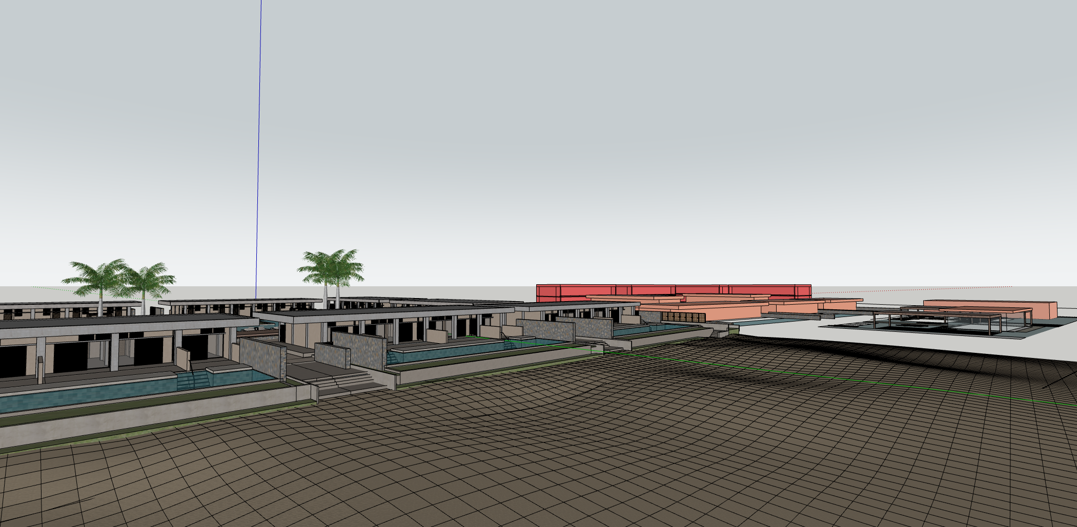 a hyper realistic image of a sea front hotel with swimming pools in modernist style with warm colors