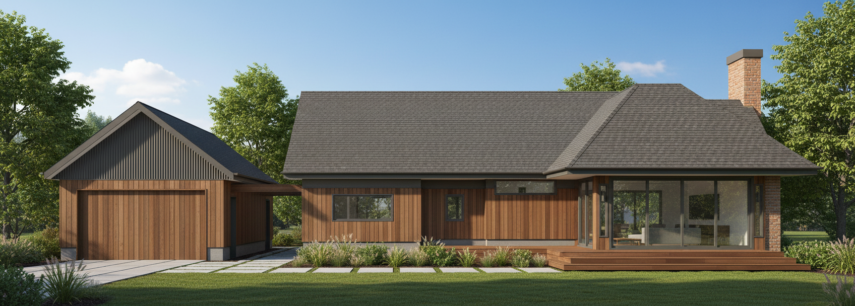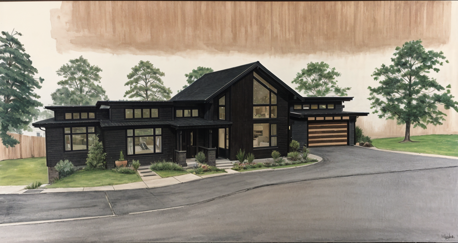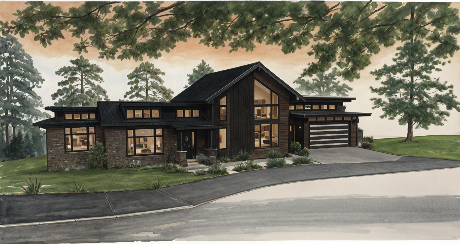 artistic grainy watercolor rendering of house with black and medium tone warm wood siding surrounded by oak tree forest and leafy forrest floor some branches in the foreground dense forest background asphalt driveway where indicated architecture