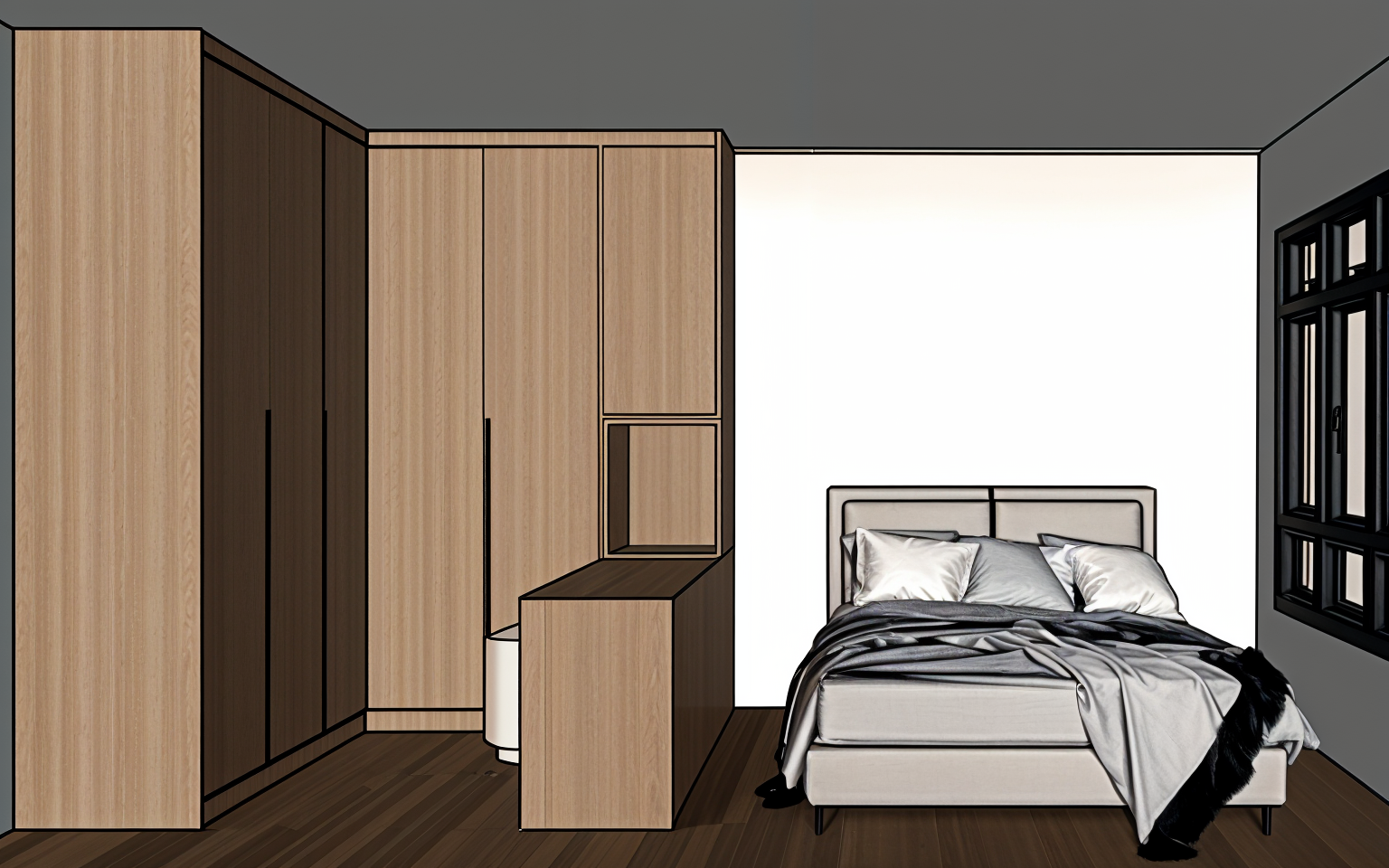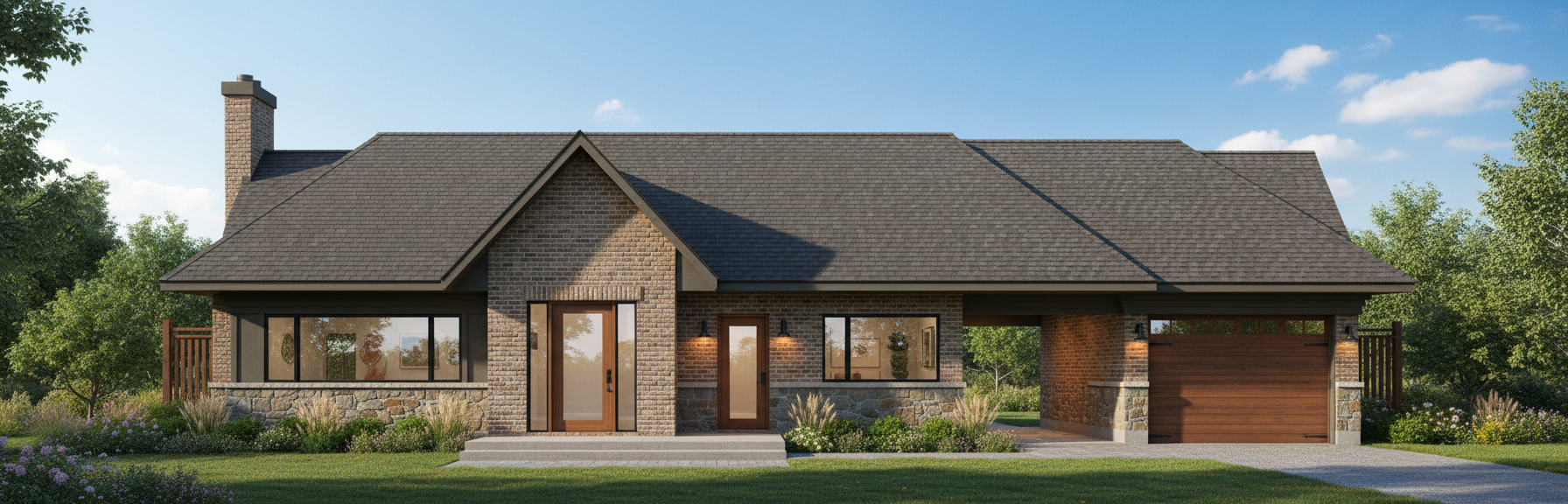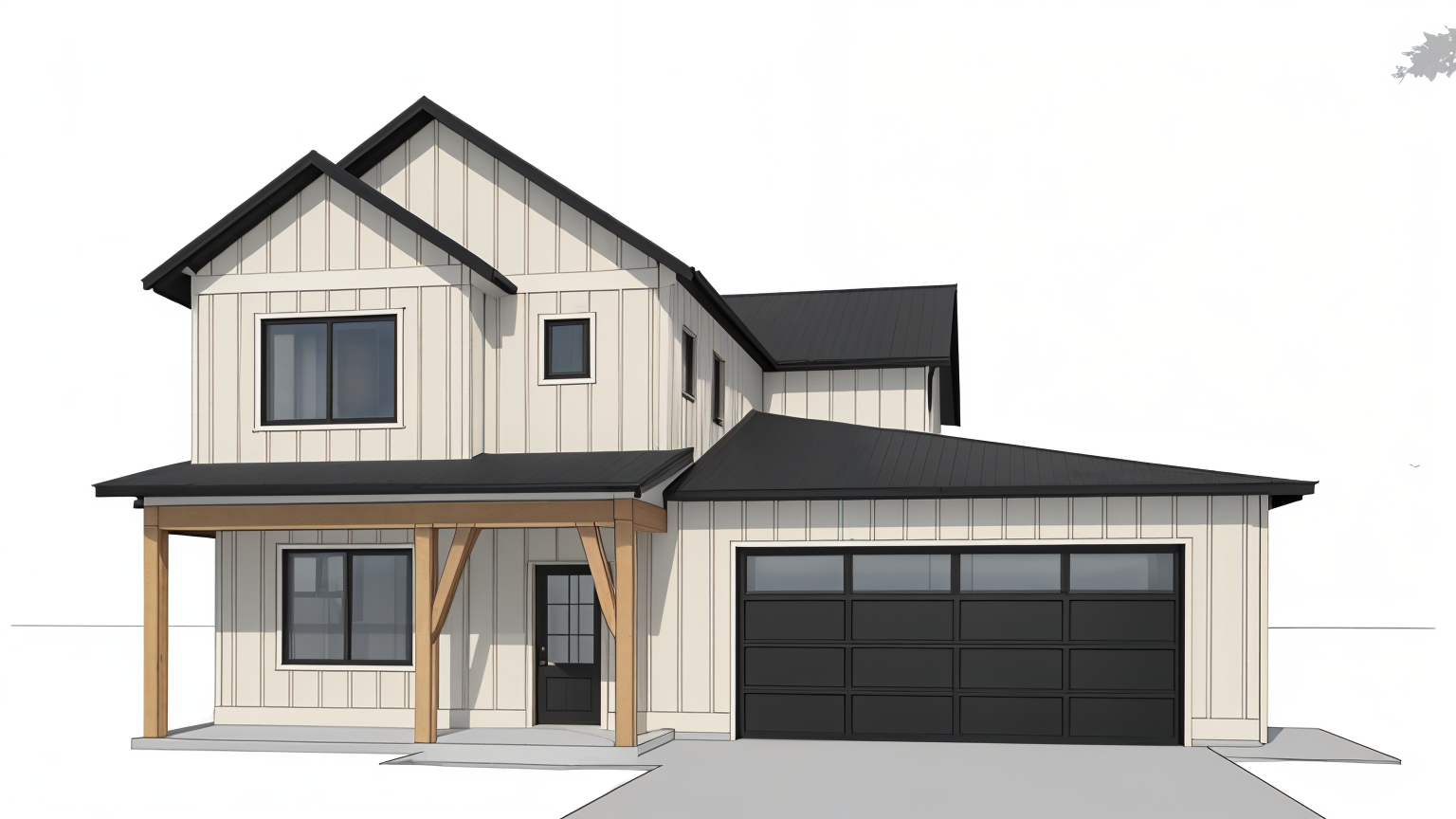 artistic grainy watercolor rendering of house with black and medium tone warm wood siding surrounded by oak tree forest and leafy forrest floor some branches in the foreground dense forest background asphalt driveway where indicated architecture
