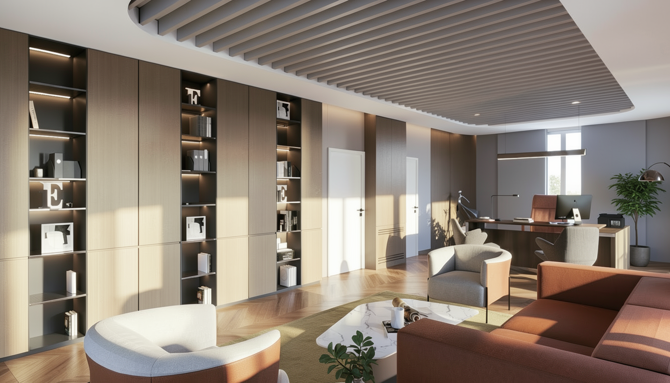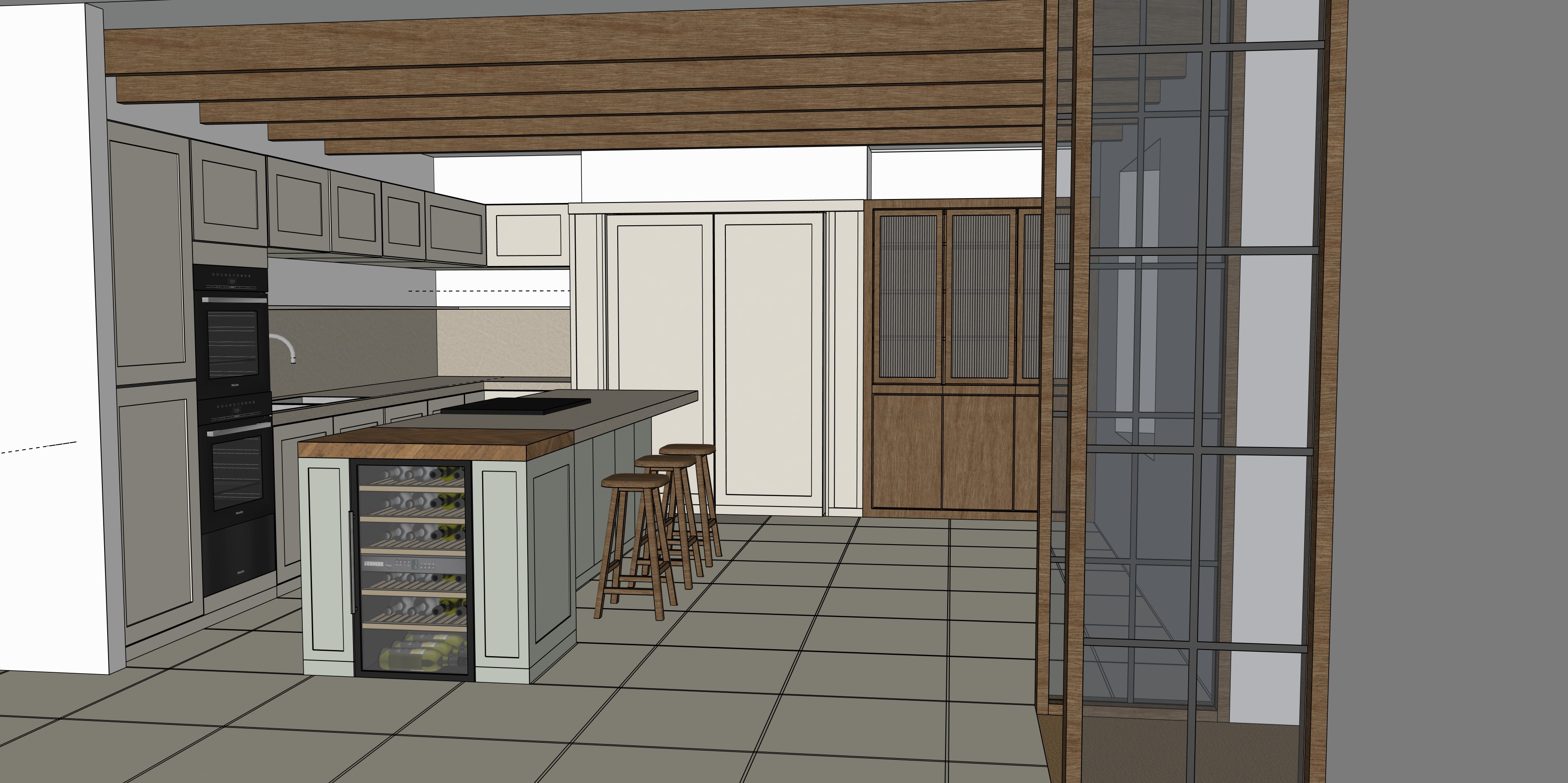 add an eight seater dining table to the right hand side of the image add reeded glass to the right rear unit add pantry items to the centre rear unit add three only glass pendant lights above the kitchen island change nothing else within the image