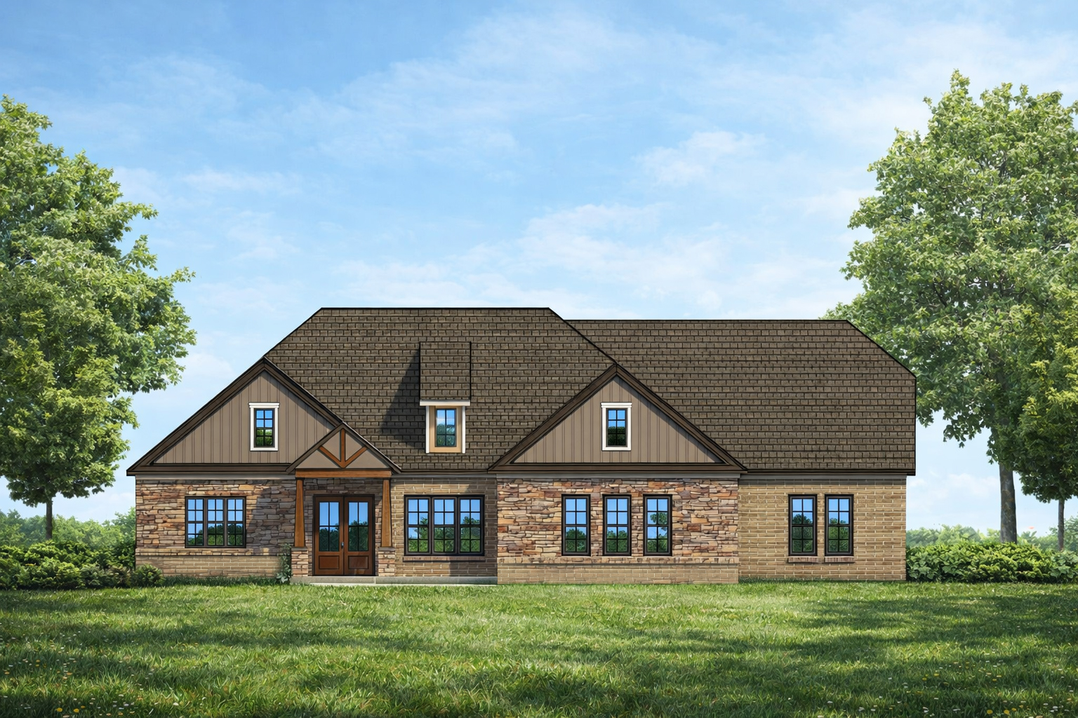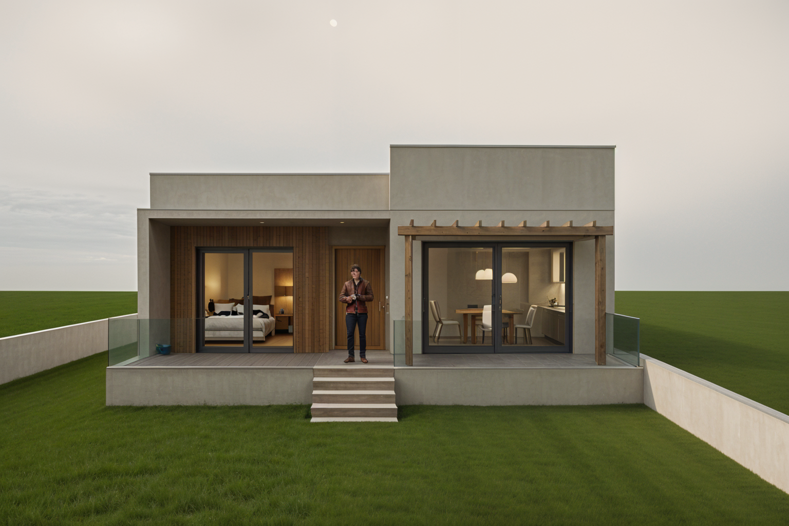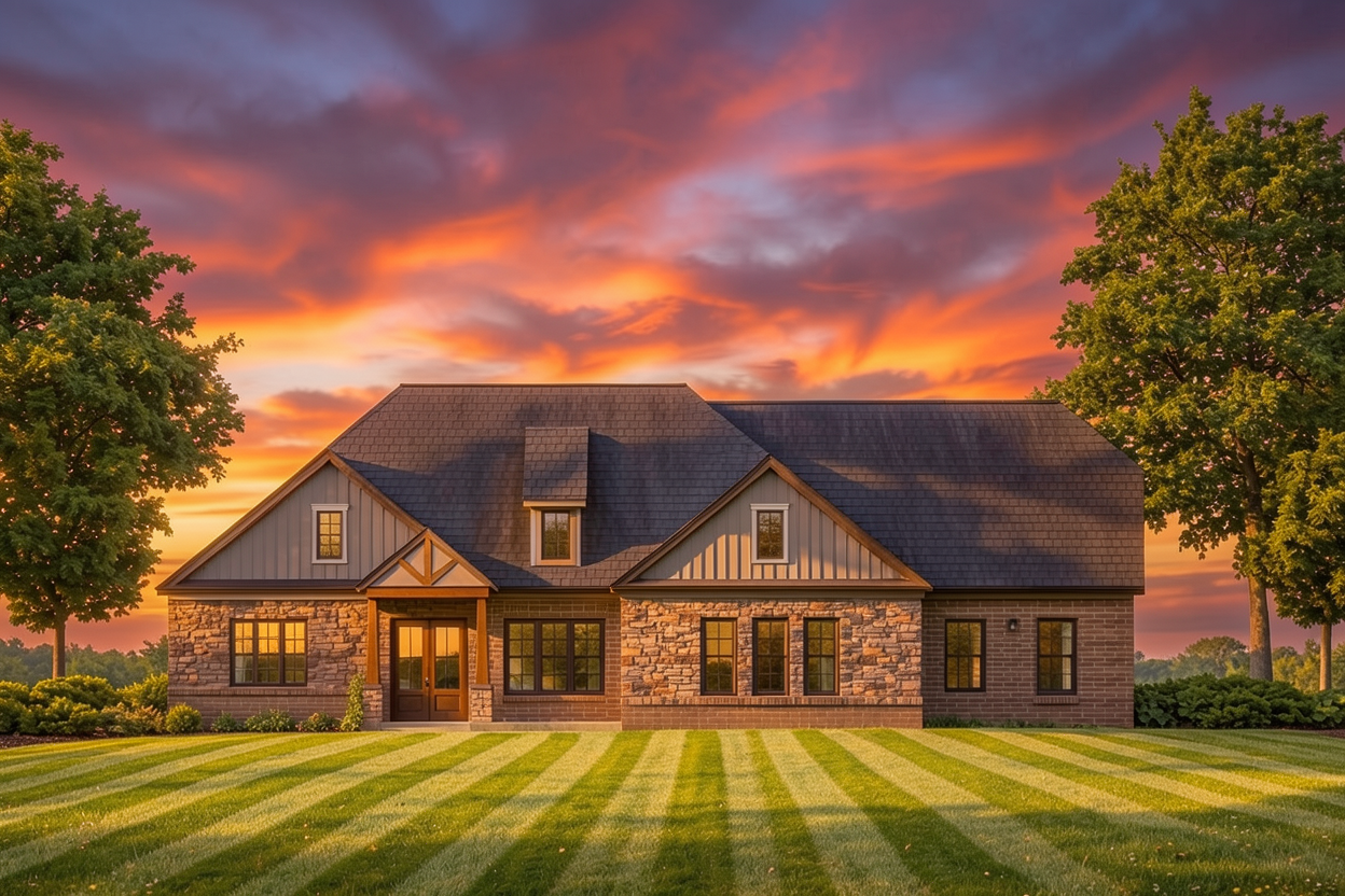 photorealistic vibrant sunset beautiful landscaping striped short lawn brand new house no wear