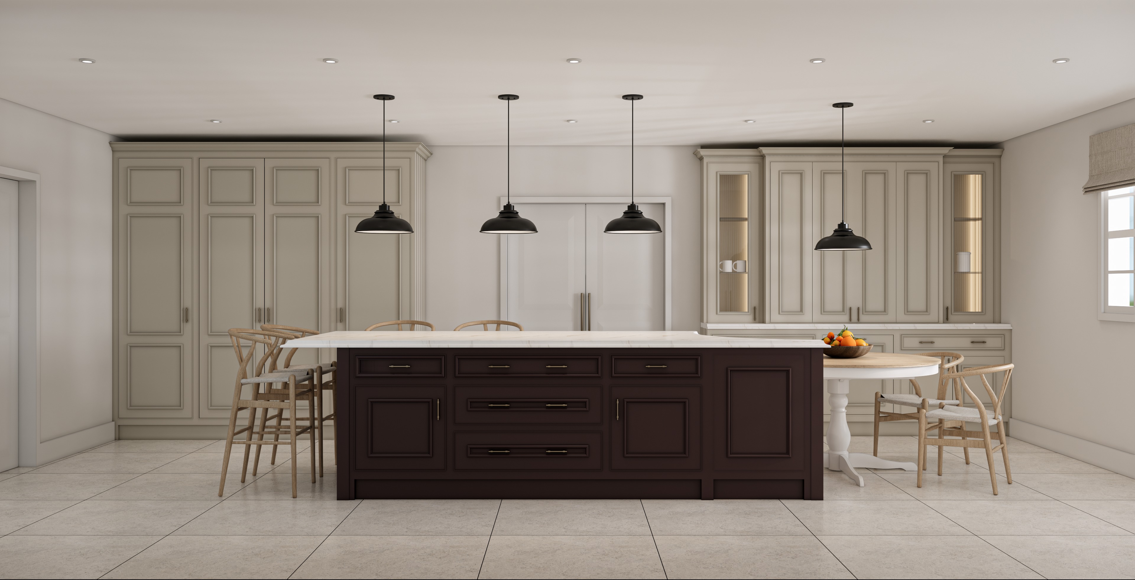 ultra realistic luxury kitchen interior island in farrow ball mahogany with soft eggshell finish ceiling recessed spotlights switched on with realistic ies beam patterns visible on ceiling and upper walls warm 3000k artificial lighting pendant lights illuminated with soft internal glow and natural downward falloff onto island surface realistic shadow pooling beneath island no under cabinet lighting balanced contrast between cool daylight from right window 5600k and warm artificial light natural shadow gradients soft ceiling bloom around spotlights realistic wall light bounce architectural photography style high dynamic range v ray corona level realism 8k detail daylight