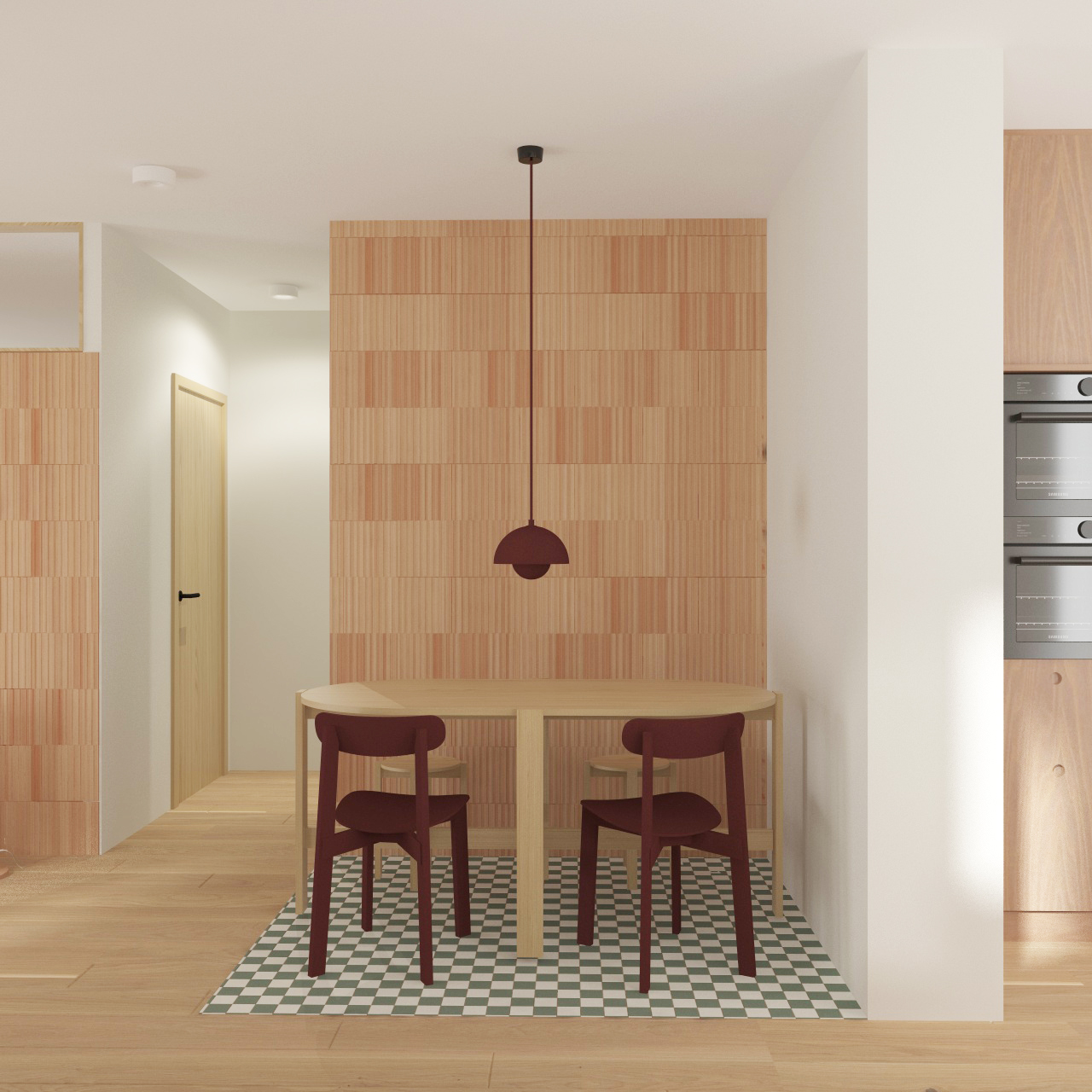 enhance the realism of this architectural visualization without changing any materials colors textures finishes furniture layout proportions or design elements keep all existing materials and color tones exactly as they are improve photorealism by refining natural lighting global illumination soft shadows subtle reflections accurate light bounce and realistic exposure add physically accurate light behavior micro contrast depth and subtle imperfections very delicate surface irregularities fine texture detail while preserving the original look improve realism through physically correct daylight simulation soft contact shadows realistic ambient occlusion subtle material roughness refinement without altering material type or color enhanced depth of field very subtle natural cinematic but natural color grading no color shift high dynamic range lighting do not redesign restyle recolor replace materials or modify objects maintain the exact same design only increase realism and photographic quality output should look like a professional architectural photograph ultra realistic natural balanced high end visualization the chairs and the lamp above the table are dark red