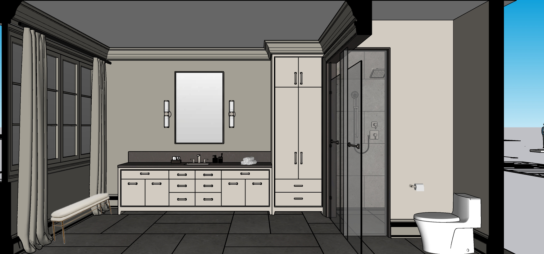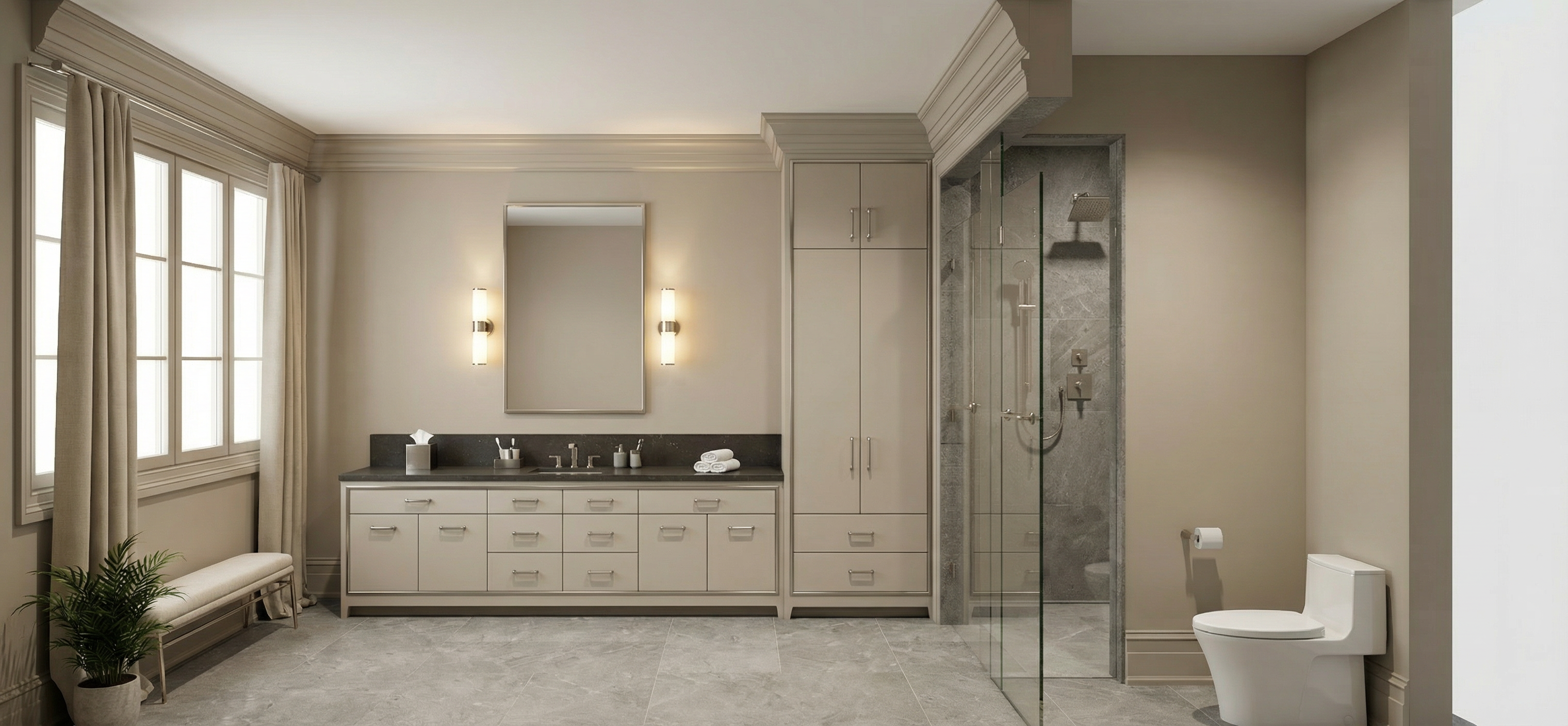 project type photorealistic interior bathroom rendering reference use the provided bathroom image as a strict reference replicate the exact layout proportions architectural details and design intent design consistency maintain the same plumbing fixtures lighting fixtures moldings floor pattern colors and decorative details as the reference no changes to geometry dimensions or fixture placement floor gray stone porcelain tile with a natural finish the floor pattern must exactly match the reference image shower walls gray stone porcelain tile matching the floor all other walls smooth painted drywall in the same color as the reference image slightly gray casing trim and crown molding painted in the same tone and finish as the walls millwork cabinetry and drawers as per reference proportions color and design 19 mm brushed nickel trim surrounding the drawers exterior not individually lighting all lighting fixtures must be turned on match the reference image placement color temperature and intensity soft realistic interior illumination with accurate shadows and reflections windows treatments windows must include curtain with rod window size placement and blind positioning must follow the reference image exactly accessories styling bathroom accessories must be placed on top of the sink counter following the reference layout vanity sink should have a countertop that follows the same color as the reference mirror the mirror must follow the reference image exactly rectangular mirror with brushed nickel frame the reflection should show only the wall surface with no reflection of other architectural elements fixtures or furnishings accessories include kleenex box toothbrush and holder soap dispenser clean towels accessories should be realistically scaled and naturally arranged not decorative reinterpretations adjust perspective in seating next to the windos but respect model and propotions legs to be brushed nickel rendering style quality ultra photorealistic materials and textures accurate scale and proportions realistic shadows reflections and ambient occlusion professional interior photography style high resolution render