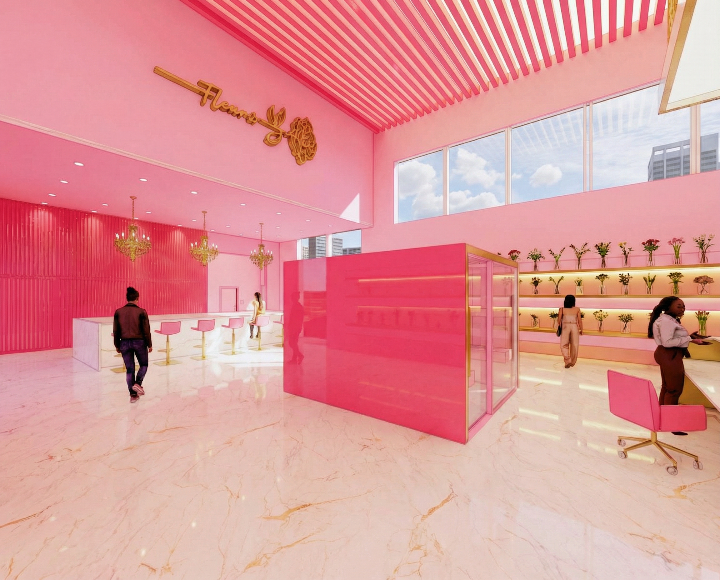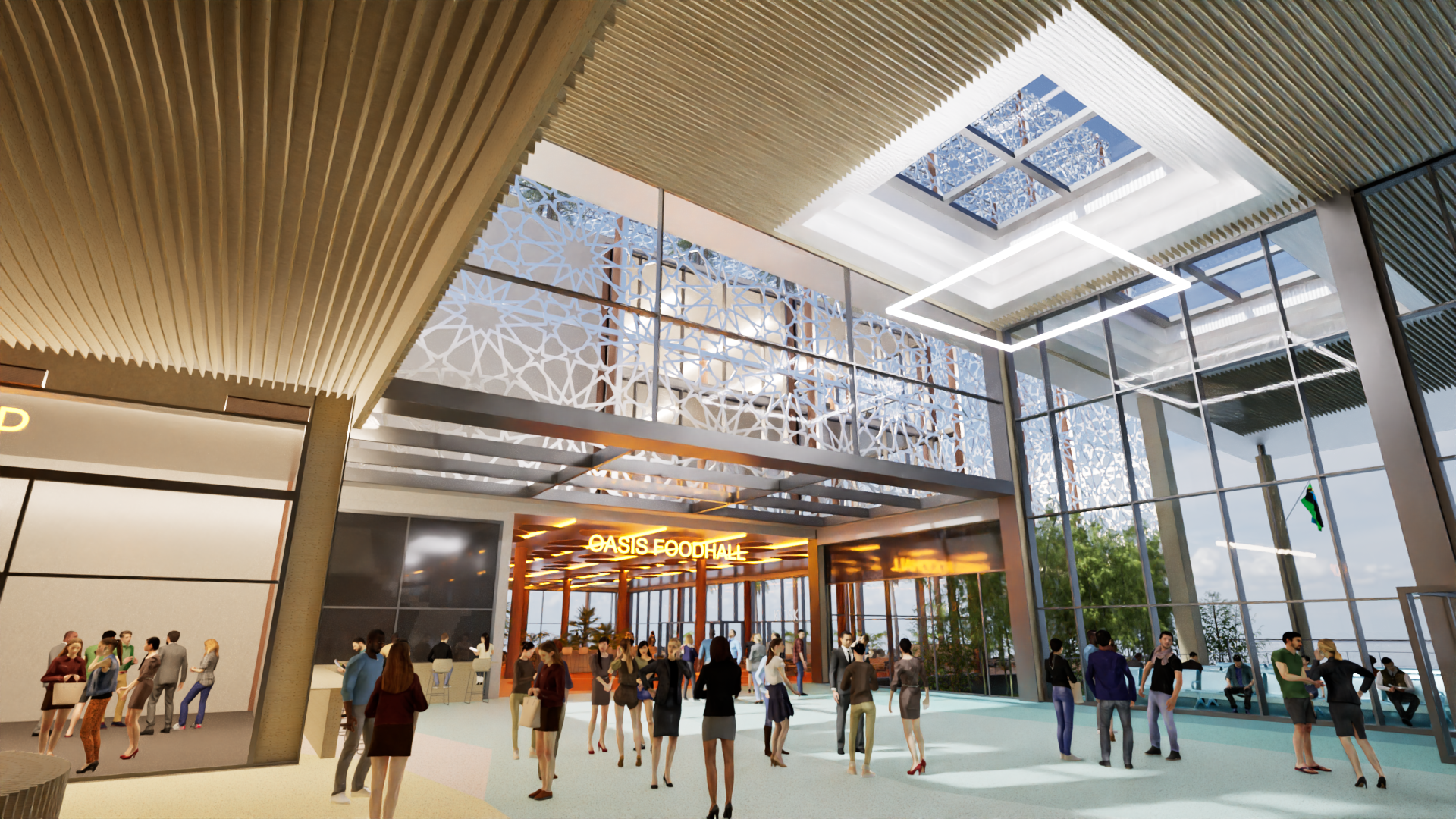 the image depicts a modern airy indoor space with high ceilings large windows and a ceiling adorned with intricate patterns people are gathered in the area engaged in various activities with a sign reading oasis foodhall visible in the background
