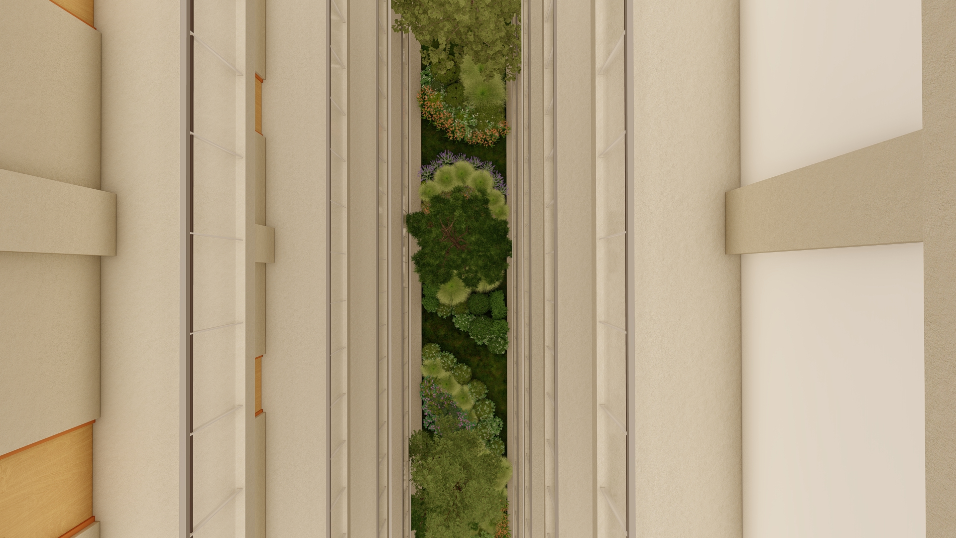 modern interior from the top change and modify the materials in the existing photo to modern contemporary materials in warm gray tones and match the following for the walls and columns polished plaster in light greige for the floors 600x600mm porcelain tile in light grey beige match the walls and columns for the wooden doors natural wood in tanguile for the railings make the tempered glass reflective and the railings matte black only on the second floor make it cinematic photorealistic 4k resolution 16mm camera lens balance the artificial lighting and brightness suited for a lobby and sunset daylighting but only on the part with the garden architecture