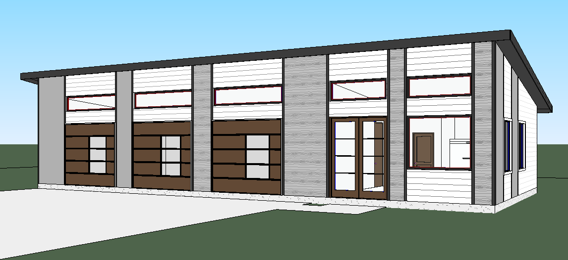 add natural lighting make look realistic add surrounding trees and nice landscaping the white siding is horizontal the other siding is horizontal rock