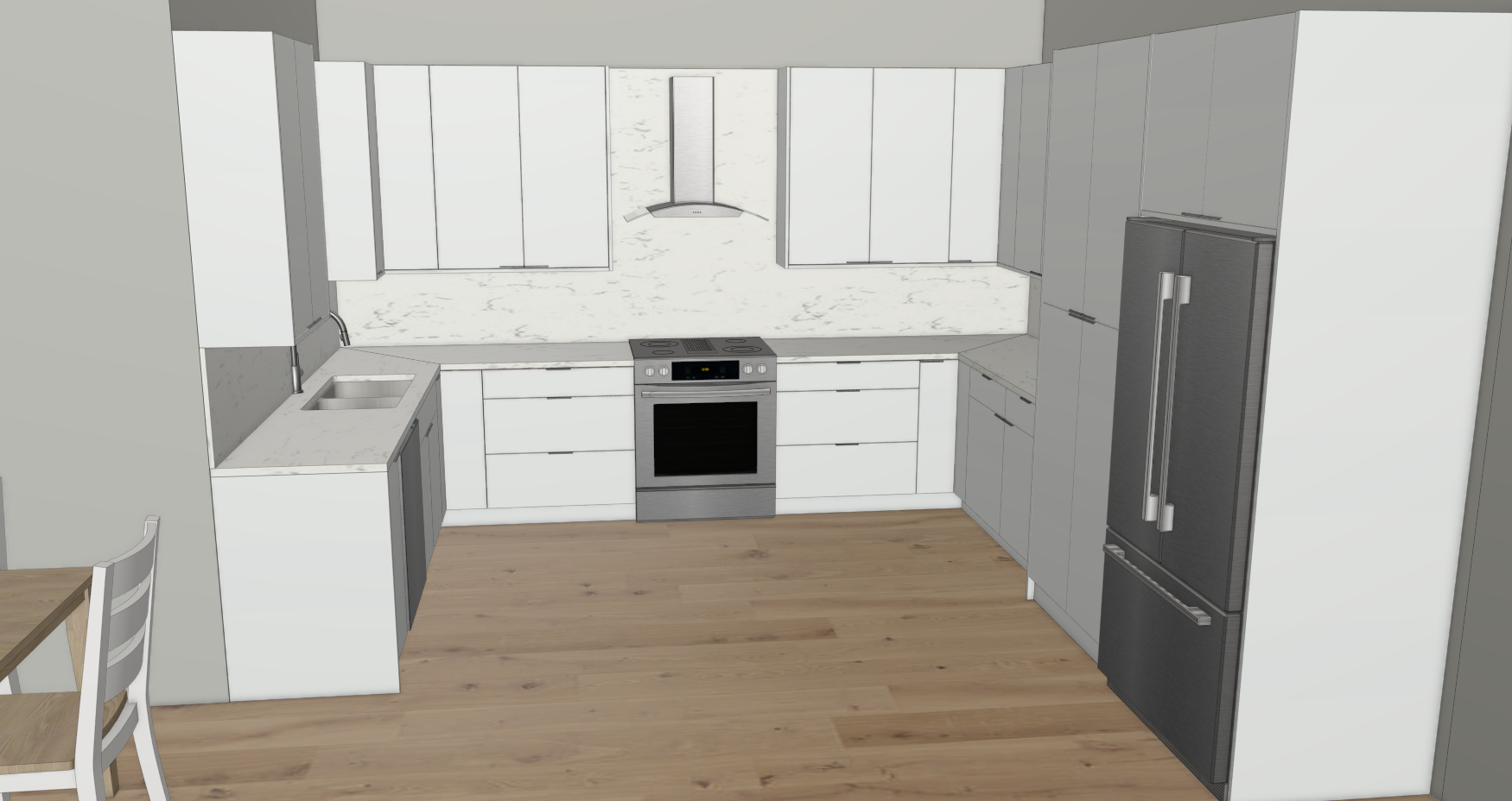 create a high end photorealistic render of the provided kitchen design important do not modify the layout do not add remove resize or relocate any cabinets appliances walls or structural elements keep the exact cabinet configuration and proportions as shown in the original design only enhance materials lighting realism and atmosphere design requirements cabinet finish high gloss white acrylic lacquer ultra smooth reflective surface premium finish maintain exact cabinet design door style and layout add subtle realistic caulking details where cabinets meet walls and backsplash countertop and backsplash white marble with soft natural veining refined elegant look realistic depth and subtle gloss increase material realism with natural light reflections and micro texture flooring replace current floor with medium format white porcelain tiles with elegant black veining modern marble look tiles matte or soft satin finish clean grout lines minimal spacing contemporary luxury style ceiling add a modern flat ceiling with integrated recessed led downlights warm neutral light 3000k 3500k evenly distributed lighting soft ambient glow without harsh shadows appliances increase realism significantly brushed stainless steel texture accurate reflections subtle fingerprints and material depth realistic glass on oven door real metallic handles refrigerator enhance brushed metal texture and reflections without changing its position or dimensions faucet and sink add realistic stainless steel finish water reflection and depth atmosphere styling create a modern elegant high end contemporary kitchen environment you may add subtle decorative elements for realism such as a minimal vase with greenery a small bowl with fruit a modern coffee maker elegant countertop accessories soft indirect natural daylight entering from an unseen source decor should be minimal and sophisticated do not clutter the space lighting combine natural daylight with warm recessed ceiling lighting to create a balanced premium showroom atmosphere soft shadows global illumination realistic reflections on glossy cabinets camera wide angle but natural perspective eye level view architectural photography style high dynamic range ultra realistic render quality