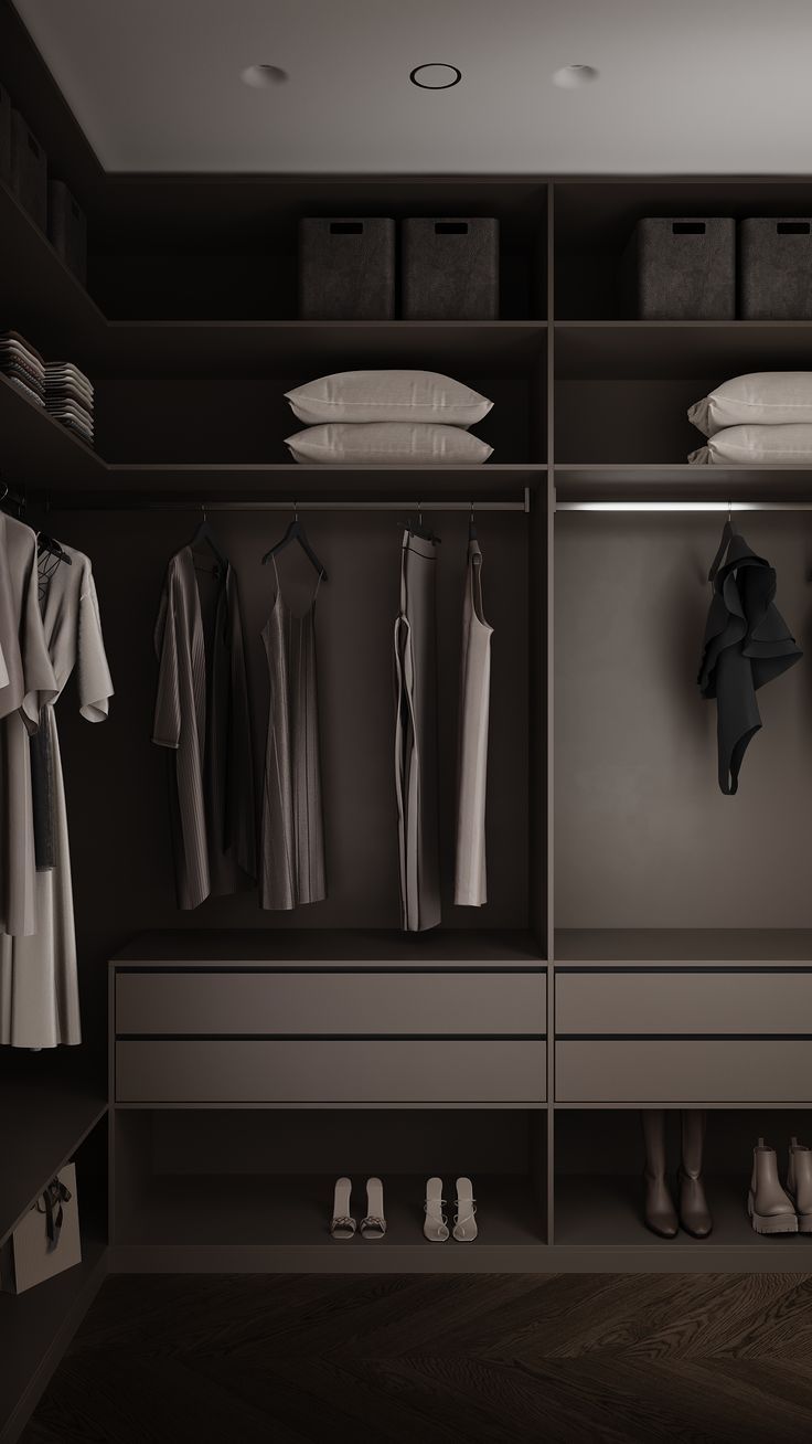 we re going for a gothic brutalism theme in the design black clothing rod with integrated lighting black charcoal cabinets and shelves grey ceiling mens clothing and shoes in closet