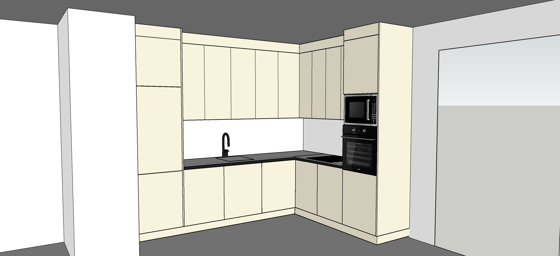 render this kitchen very well at the right side there are 2 outdoor doors with nature view