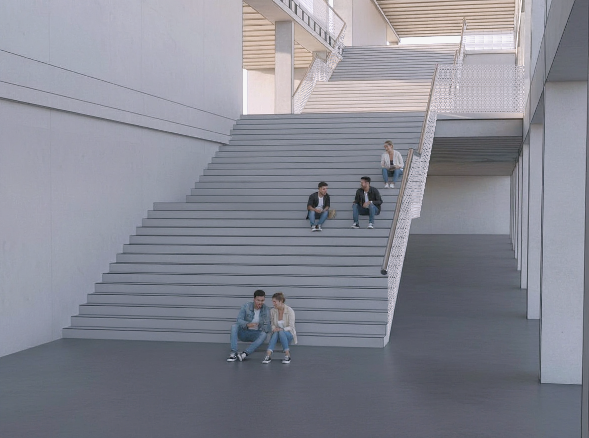 make the rooms less empty add peple having fun working getting together add plants an people walking