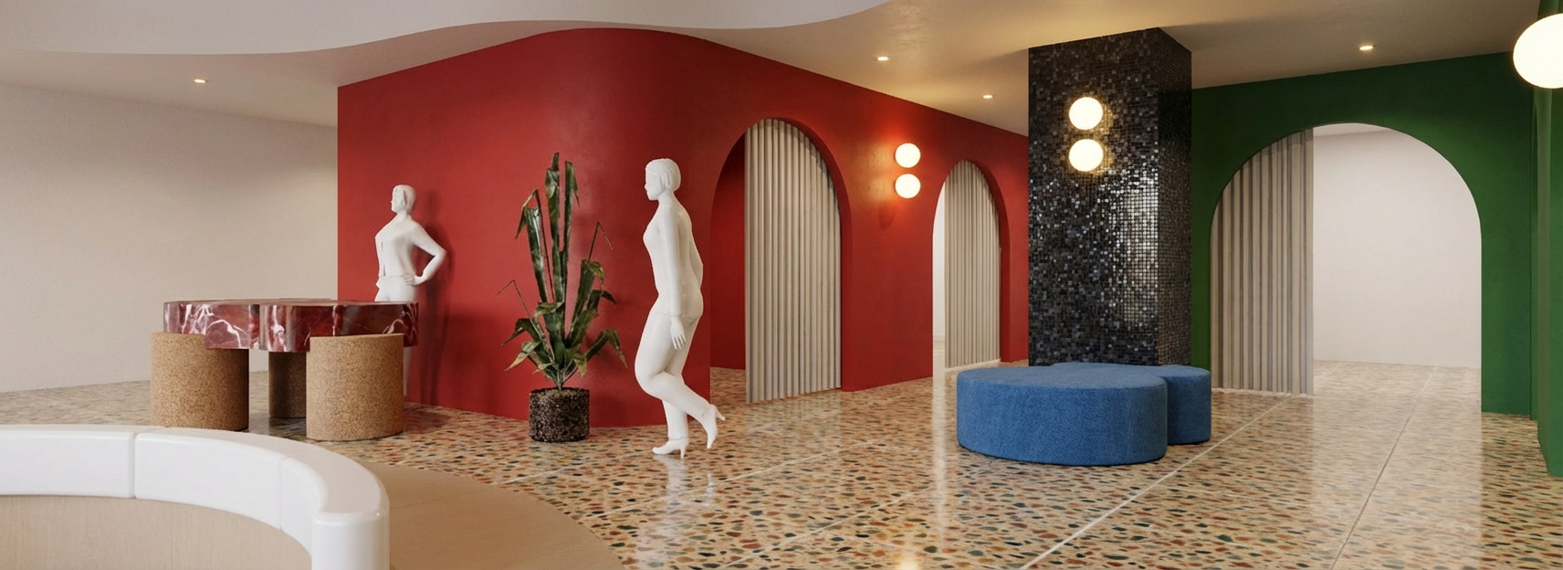 ultra realistic editorial interior render preserve composition camera and overall lighting atmosphere ceiling upper plane made of thick natural cane ca izo tropical style irregular organic pattern not uniform behind it a soft artificial skylight panel smooth almost imperceptible surface subtle glow diffused light not harsh back wall lattice all brown lattice with circular pattern made of natural clay pieces roof tile material visible joints and piece definition matte earthy texture with slight tonal variation no plastic or uniform finish vegetation highly natural dense and organic variation in leaf tone imperfections and translucency proper light interaction subtle reflections depth shadow layering no leaves intersecting or penetrating walls or lattice clean geometry correct contact furniture wood in similar tone but hyperrealistic finish matte natural grain subtle variation no plastic look no excessive gloss refined high end appearance bench seating continuous rectangular linen cushions thin but softly padded slight compression where in contact with base perfectly fitted to bench no overhang natural linen texture visible weave matte soft comfortable realistic floor large format rectified porcelain tiles sand tone very minimal joints matte soft reflection subtle texture walls clay plaster finish organic surface with subtle variation in tone and sheen slight imperfections controlled and realistic correct scale not exaggerated texture signage aloe in polished bronze slight relief from wall subtle reflections not mirror like lighting maintain current warm ambient atmosphere soft diffused balanced no overexposure gentle highlights on materials overall look editorial poetic high end interior natural materials tactile surfaces calm atmosphere no artificial or plastic appearance