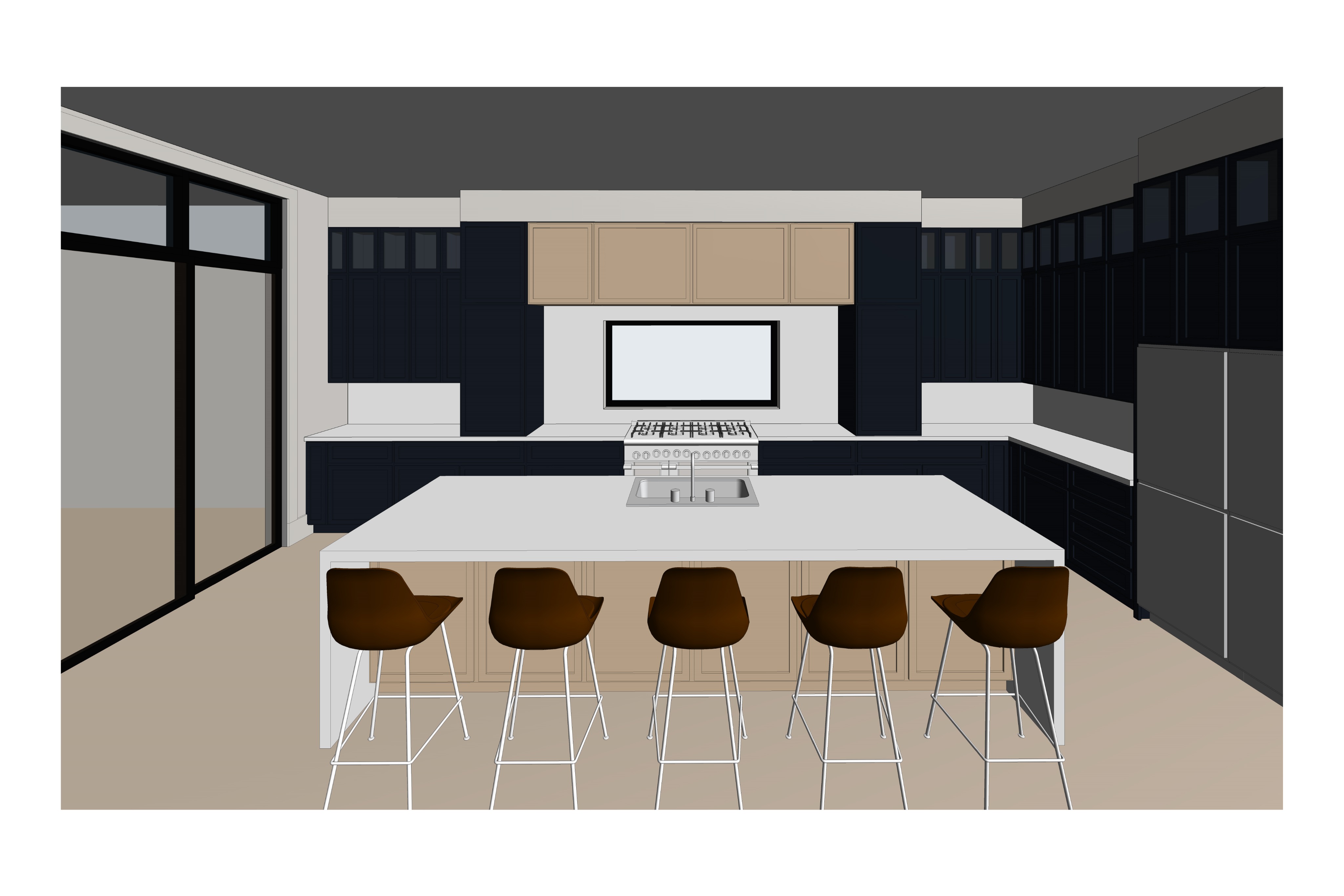 add can lights to ceiling light oak wood floors add modern office decor to room on other side of the glass door add trees outside window above stove add kitchen decor on counters stainless steel appliances lots of light