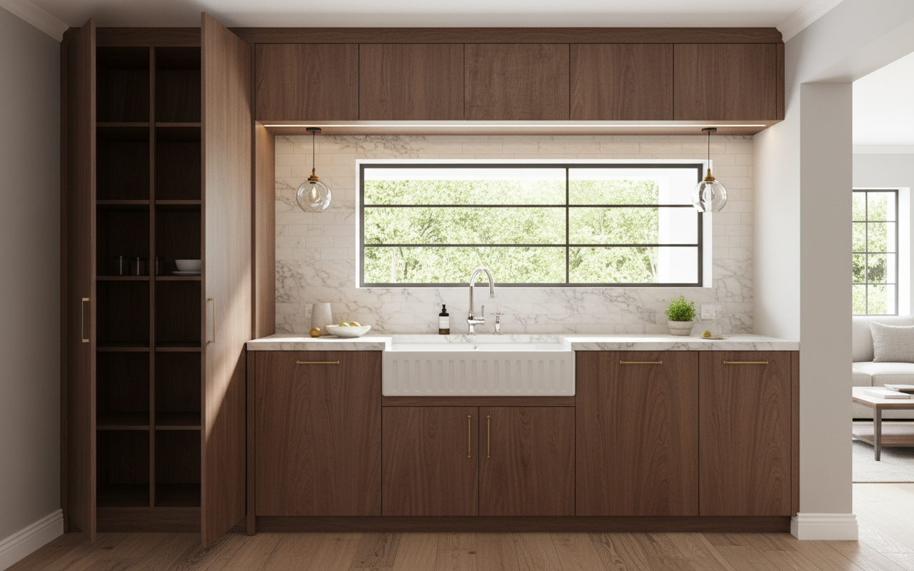 replace the cabinet wood to match the wood in the reference image