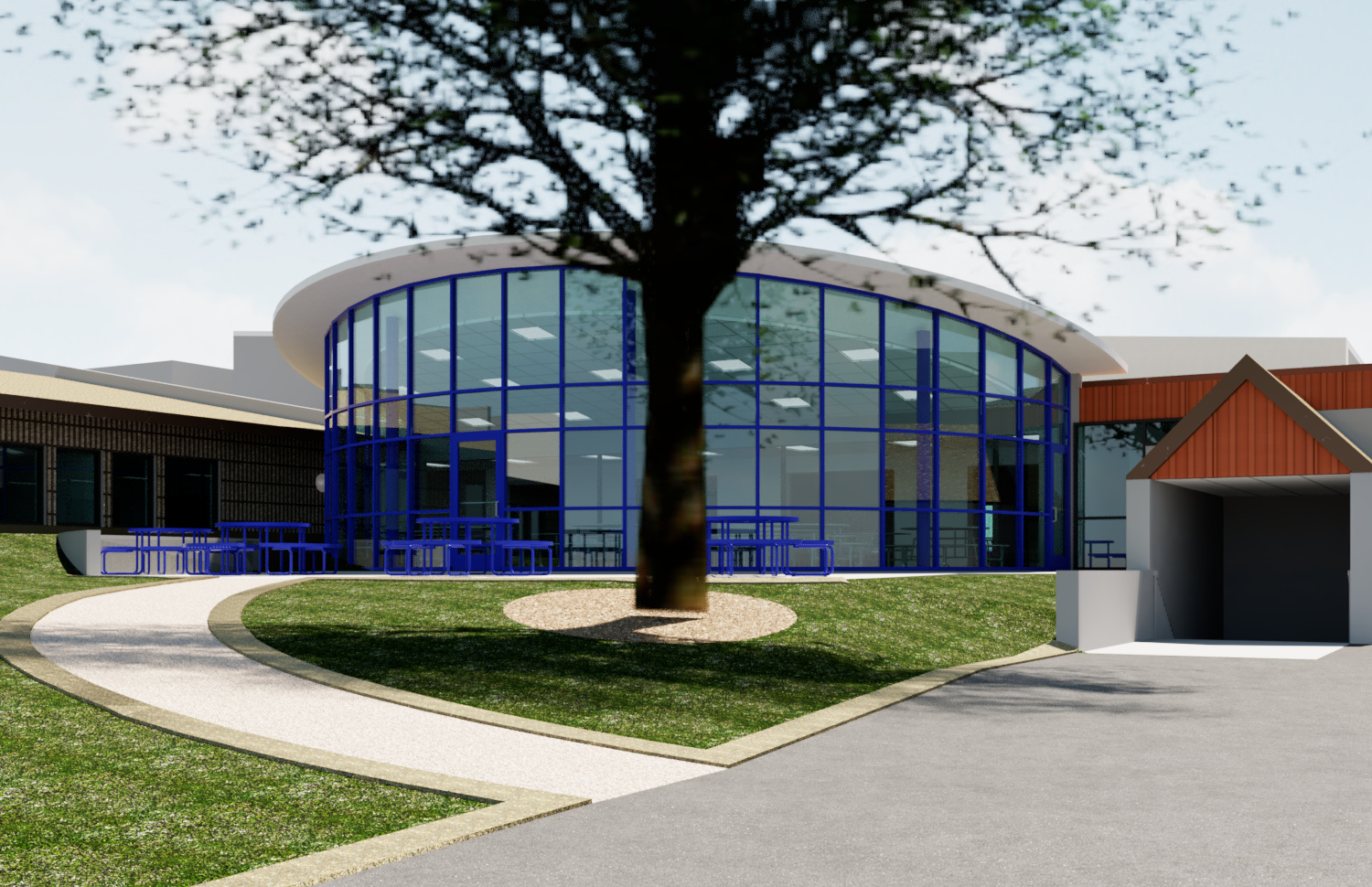 add students siting at existing blue picnic tables add decorative landscaping around base of tree add decorative landscaping along left edge of curved sidewalk add blue sky with fluffy clouds darken pavement make tree more realistic architecture